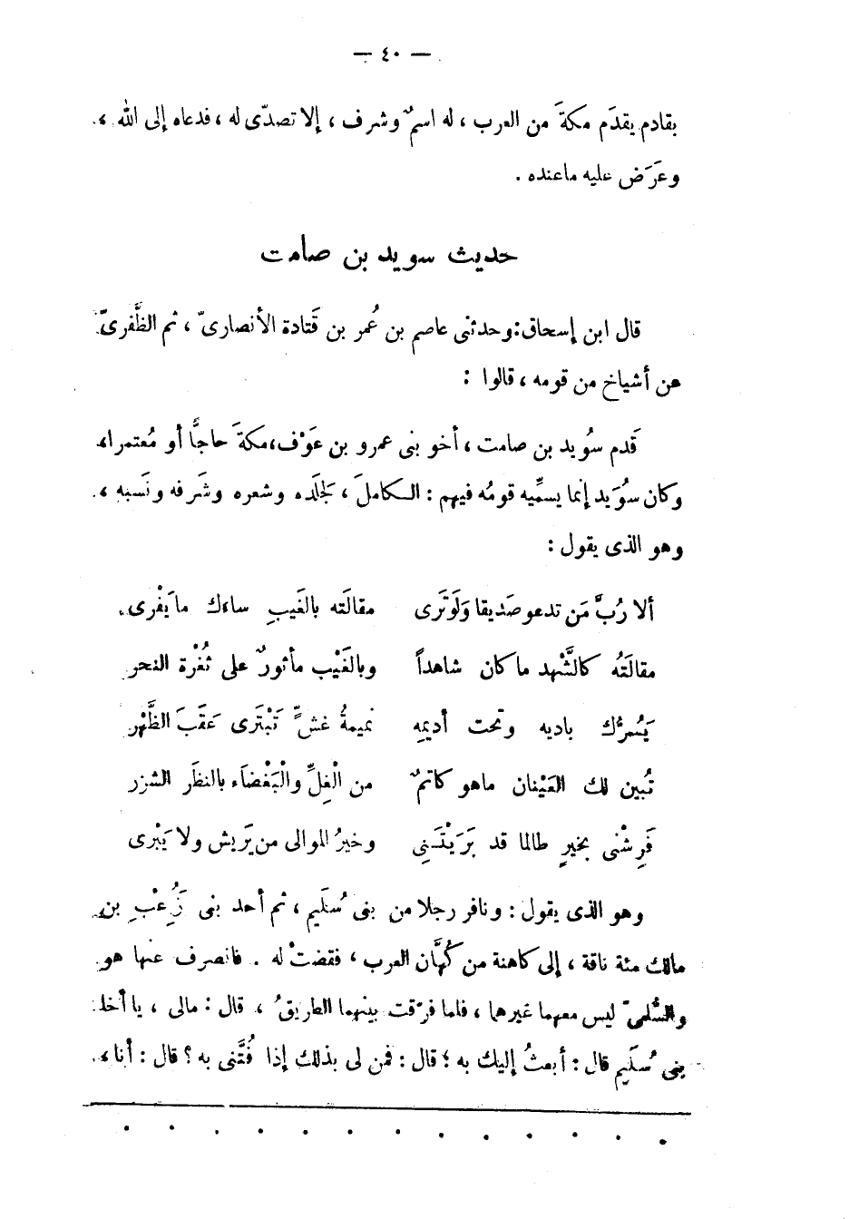 قَدِمَ سُوَيْدُ بْنُ صَامِتٍ، أَخُو بَنِي عَمْرِو بْنِ عَوْفٍ، مَكّةَ حَاجّا أو معتمرا، وَكَانَ سُوَيْدُ إنّمَا يُسَمّيهِ قَوْمُهُ فِيهِمْ: الْكَامِلَ، لِجَلَدِهِ وَشِعْرِهِ وَشَرَفِهِ وَنَسَبِهِ، وَهُوَ الّذِي يَقُولُ:
