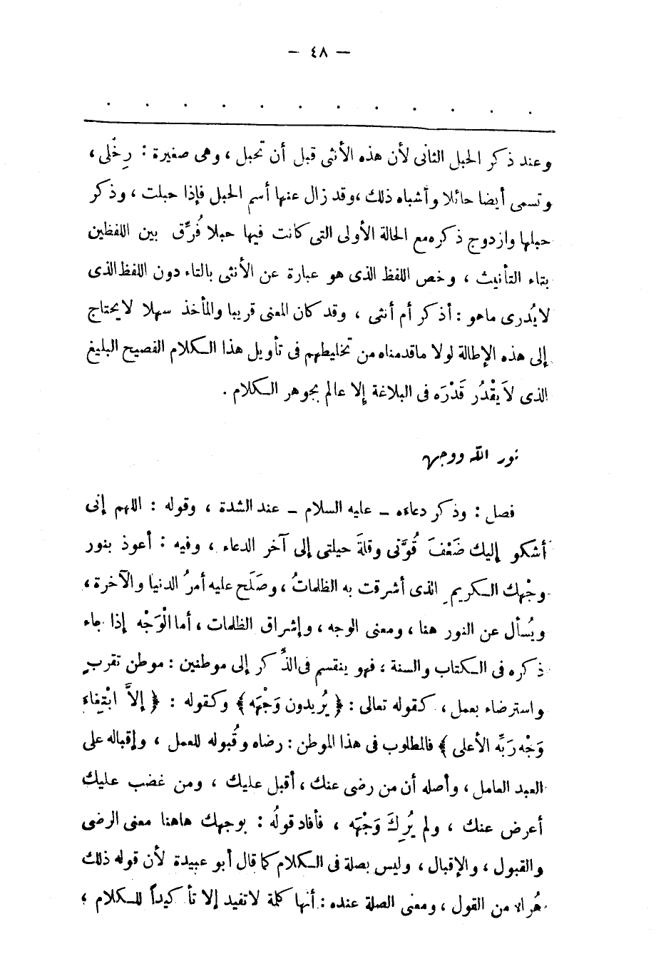 نُورُ اللهِ وَوَجْهُهُ فَصْلٌ: وَذَكَرَ دُعَاءَهُ- عَلَيْهِ السّلَامُ- عِنْدَ الشّدّةِ، وَقَوْلُهُ: اللهُمّ إنّي أَشْكُو إلَيْك ضَعْفَ قُوّتِي وَقِلّةَ حِيلَتِي إلَى آخِرِ الدّعَاءِ، وَفِيهِ: أَعُوذُ بِنُورِ وَجْهِك الْكَرِيمِ الّذِي أَشْرَقَتْ بِهِ الظّلُمَاتُ، وَصَلُحَ عَلَيْهِ أَمْرُ الدّنْيَا وَالْآخِرَةِ، وَيُسْأَلُ عَنْ النّورِ هُنَا، وَمَعْنَى الْوَجْهِ، وَإِشْرَاقِ الظّلُمَاتِ، أَمَا الْوَجْهُ إذَا جَاءَ ذِكْرُهُ فِي الْكِتَابِ وَالسّنّةِ، فَهُوَ يَنْقَسِمُ فِي الذّكْرِ إلَى مَوْطِنَيْنِ: مَوْطِنِ تَقَرّبٍ وَاسْتِرْضَاءٍ بِعَمَلِ، كَقَوْلِهِ تعالى: يُرِيدُونَ وَجْهَهُ وكقوله: إِلَّا ابْتِغاءَ وَجْهِ رَبِّهِ الْأَعْلى فَالْمَطْلُوبُ فِي هَذَا الْمَوْطِنِ: رِضَاهُ وَقَبُولُهُ لِلْعَمَلِ، وَإِقْبَالُهُ عَلَى الْعَبْدِ الْعَامِلِ، وَأَصْلُهُ أَنّ مَنْ رَضِيَ عَنْك، أَقْبَلَ عَلَيْك، وَمَنْ غَضِبَ عَلَيْك أَعْرَضَ عَنْك، وَلَمْ يُرِك وَجْهَهُ، فَأَفَادَ قَوْلُهُ: بِوَجْهِك هَاهُنَا مَعْنَى الرّضَى وَالْقَبُولِ، وَالْإِقْبَالِ، وَلَيْسَ بِصِلَةِ فِي الْكَلَامِ كَمَا قَالَ أَبُو عُبَيْدَةَ لِأَنّ قَوْلَهُ ذَلِكَ هُرَاءٌ مِنْ الْقَوْلِ، وَمَعْنَى الصّلَةِ عِنْدَهُ: أَنّهَا كَلِمَةٌ لَا تُفِيدُ إلّا تأكيدا للكلام،