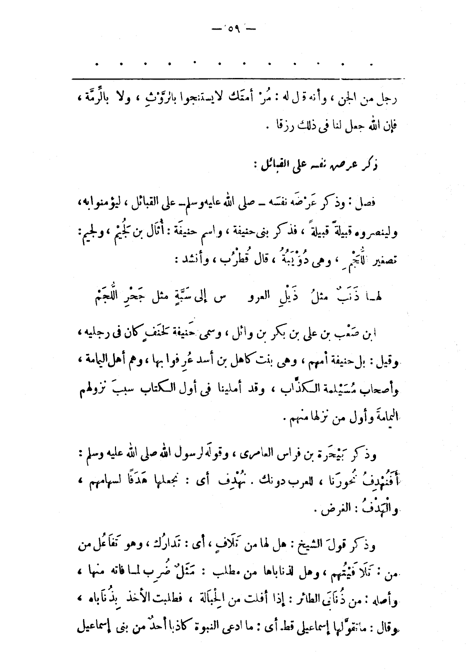 فَصْلٌ: وَذَكَرَ عَرْضَهُ نَفْسَهُ- صَلَّى اللَّهُ عَلَيْهِ وَسَلَّمَ- عَلَى الْقَبَائِلِ، لِيُؤْمِنُوا بِهِ، وَلِيَنْصُرُوهُ قَبِيلَةً قَبِيلَةً، فَذَكَرَ بَنِي حَنِيفَةَ، وَاسْمُ حَنِيفَةَ: أُثَالُ بْنُ لُجَيْمٍ، وَلُجَيْمٌ: