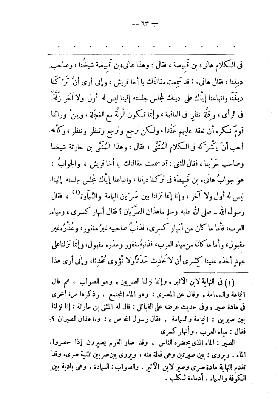 هو جواب هانىء بْنِ قَبِيصَةَ فِي تَرْكِنَا دِينَنَا، وَاتّبَاعِنَا إيّاكَ لِمَجْلِسِ جَلَسْته إلَيْنَا لَيْسَ لَهُ أَوّلٌ وَلَا آخِرُ، وَإِنّا إنّمَا نَزَلْنَا بَيْنَ صَرَيَانِ الْيَمَامَةِ وَالسّمَاوَةِ «1» ، فَقَالَ رَسُولُ اللهِ- صَلَّى اللَّهُ عَلَيْهِ وَسَلَّمَ مَا هَذَانِ الصّرَيَانِ؟ فَقَالَ أَنْهَارُ كِسْرَى، وَمِيَاهُ الْعَرَبِ، فَأَمّا مَا كَانَ مِنْ أَنْهَارِ كِسْرَى، فَذَنْبُ صَاحِبَيْهِ غَيْرُ مَغْفُورٍ، وَعُذْرُهُ غَيْرُ مَقْبُولٍ، وَأَمّا مَا كَانَ مِنْ مِيَاهِ الْعَرَبِ، فَذَنْبُهُ مَغْفُورٌ وَعُذْرُهُ مَقْبُولٌ، وَإِنّمَا نَزَلْنَا عَلَى عَهْدٍ أَخَذَهُ عَلَيْنَا كِسْرَى أَنْ لَا نُحْدِثَ حَدَثًا وَلَا نُؤْوِيَ مُحْدِثًا، وَإِنّي أَرَى هَذَا