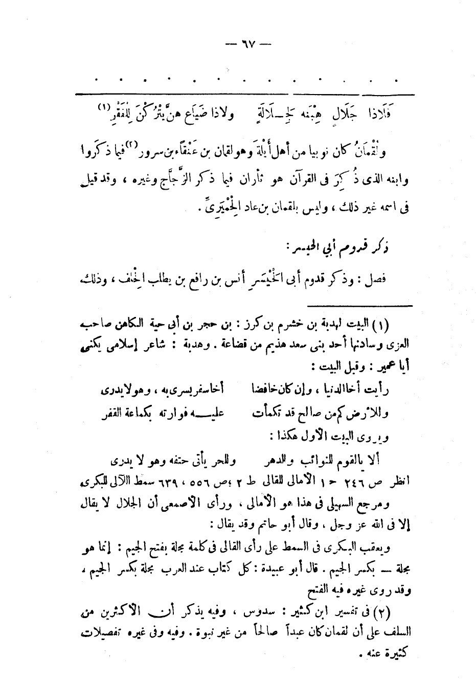 (2) فى تفسير ابن كثير: سدوس، وفيه يذكر أن الأكثرين من السلف على أن لقمان كان عبدا صالحا من غير نبوة. وفيه وفى غيره تفصيلات كثيرة عنه.
