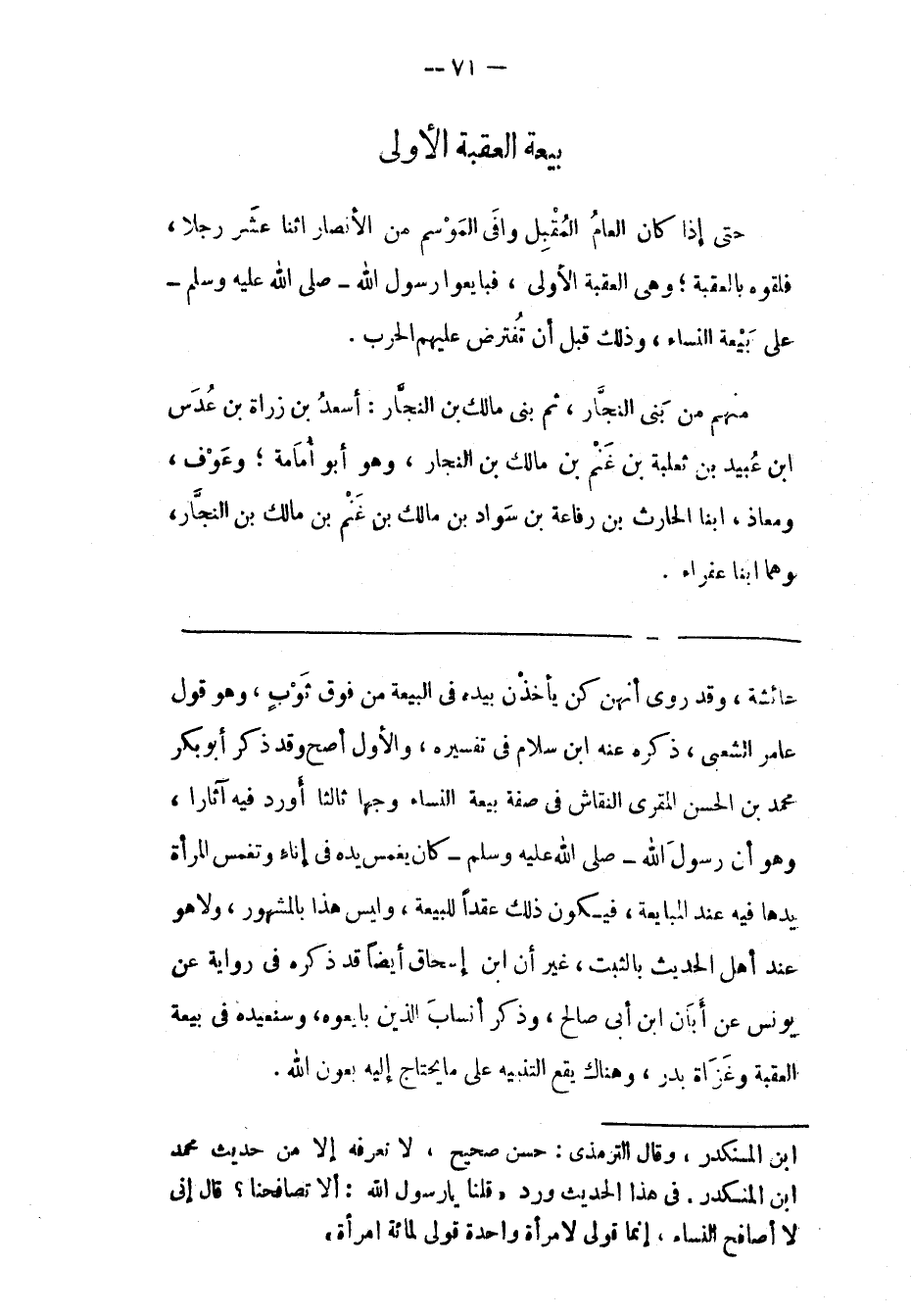 حَتّى إذَا كَانَ الْعَامُ الْمُقْبِلُ وَافَى الْمَوْسِمَ مِنْ الْأَنْصَارِ اثْنَا عَشَرَ رَجُلًا، فَلَقَوْهُ بِالْعَقَبَةِ؛ وَهِيَ الْعَقَبَةُ الْأُولَى، فَبَايَعُوا رَسُولَ اللهِ- صَلّى اللهُ عَلَيْهِ وَسَلّمَ- عَلَى بَيْعَةِ النّسَاءِ، وَذَلِكَ قبل أن تفترض عليهم الحرب.