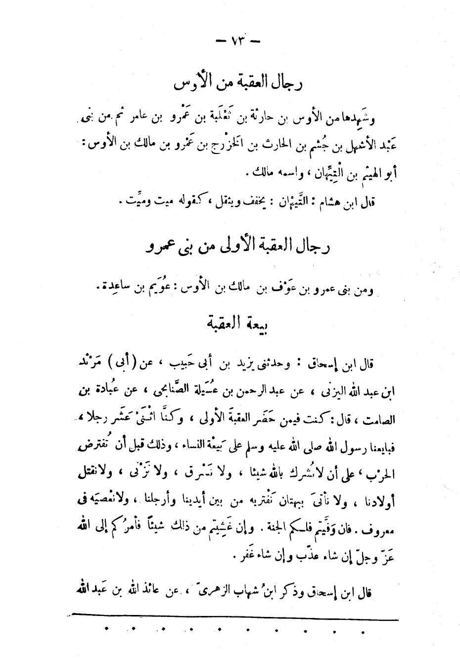 قَالَ ابْنُ إسْحَاقَ: وَحَدّثَنِي يَزِيدُ بْنُ أبى حبيب، عن (أبى) مرثد ابن عَبْدِ اللهِ الْيَزَنِيّ، عَنْ عَبْدِ الرّحْمَنِ بْنِ عُسَيْلَةَ الصّنَابِحِيّ، عَنْ عُبَادَةَ بْنِ الصّامِتِ، قَالَ: كُنْت فِيمَنْ حَضَرَ الْعَقَبَةَ الْأُولَى، وَكُنّا اثْنَيْ عَشَرَ رَجُلًا، فَبَايَعْنَا رَسُولَ اللهِ صَلّى اللهُ عَلَيْهِ وَسَلّمَ عَلَى بَيْعَةِ النّسَاءِ، وَذَلِكَ قَبْلَ أَنْ تُفْتَرَضَ الْحَرْبُ، عَلَى أَنْ لَا نُشْرِكَ بِاَللهِ شَيْئًا، وَلَا نَسْرِقَ، وَلَا نَزْنِيَ، وَلَا نَقْتُلَ أَوْلَادَنَا، وَلَا نَأْتِيَ بِبُهْتَانِ نَفْتَرِيهِ مِنْ بَيْنِ أَيْدِينَا وَأَرْجُلِنَا، وَلَا نَعْصِيَهُ فِي مَعْرُوفٍ. فإن وفيتم فلكم الجنة. وإن غشيتم من ذلك شيئا فأمر كم إلَى اللهِ عَزّ وَجَلّ إنْ شَاءَ عَذّبَ وإن شاء غفر.