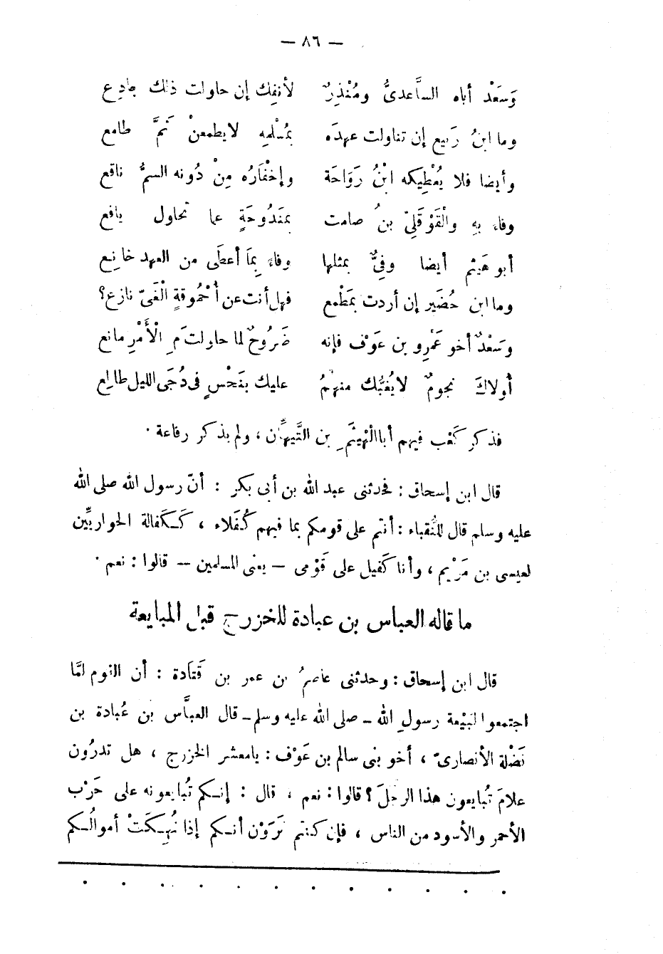قَالَ ابْنُ إسْحَاقَ: وَحَدّثَنِي عَاصِمُ بْنُ عُمَرَ بْنِ قَتَادَةَ: أَنّ الْقَوْمَ لَمّا اجْتَمَعُوا لِبَيْعَةِ رَسُولِ اللهِ- صَلّى اللهُ عَلَيْهِ وَسَلّمَ- قَالَ الْعَبّاسُ بْنُ عُبَادَةَ بْنِ نَضْلَةَ الْأَنْصَارِيّ، أَخُو بَنِي سَالِمِ بْنِ عَوْفٍ: يَا مَعْشَرَ الْخَزْرَجِ، هَلْ تَدْرُونَ عَلَامَ تُبَايِعُونَ هَذَا الرّجُلَ؟ قَالُوا: نَعَمْ، قَالَ: إنّكُمْ تُبَايِعُونَهُ عَلَى حَرْبِ الْأَحْمَرِ وَالْأَسْوَدِ مِنْ النّاسِ، فَإِنْ كُنْتُمْ تَرَوْنَ أَنّكُمْ إذَا نُهِكَتْ أَمْوَالُكُمْ