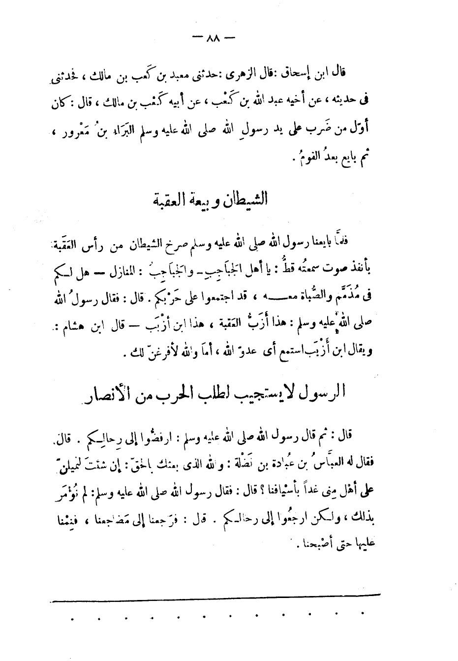 قَالَ: ثُمّ قَالَ رَسُولُ اللهِ صَلَّى اللَّهُ عَلَيْهِ وَسَلَّمَ: ارفضّوا إلى رحالكم. قال فَقَالَ لَهُ الْعَبّاسُ بْنُ عُبَادَةَ بْنِ نَضْلَةَ: وَاَللهِ الّذِي بَعَثَك بِالْحَقّ: إنْ شِئْتَ لَنَمِيلَنّ عَلَى أَهْلِ مِنًى غَدًا بِأَسْيَافِنَا؟ قَالَ: فَقَالَ رَسُولُ اللهِ صَلَّى اللَّهُ عَلَيْهِ وَسَلَّمَ: لم نُؤْمَرْ بِذَلِكَ، وَلَكِنْ ارْجِعُوا إلَى رِحَالِكُمْ. قَالَ: فَرَجَعْنَا إلَى مَضَاجِعِنَا، فَنِمْنَا عَلَيْهَا حَتّى أَصْبَحْنَا.