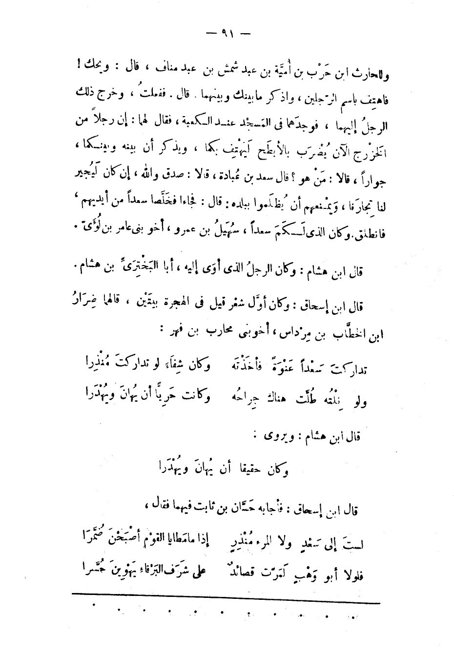 وللحارث ابن حرب بن أميّة بن عبد شمش بْنِ عَبْدِ مَنَافٍ، قَالَ: وَيْحَك! فَاهْتِفْ بِاسْمِ الرّجُلَيْنِ، وَاذْكُرْ مَا بَيْنَك وَبَيْنَهُمَا. قَالَ. فَفَعَلْت، وَخَرَجَ ذَلِك الرّجُلُ إلَيْهِمَا، فَوَجَدَهُمَا فِي الْمَسْجِدِ عِنْدَ الْكَعْبَةِ، فَقَالَ لَهُمَا: إنّ رَجُلًا مِنْ الخزرج الآن يضرب بالأبطح ليهتف بِكُمَا، وَيَذْكُرُ أَنّ بَيْنَهُ وَبَيْنَكُمَا، جِوَارًا، قَالَا: من هُوَ؟ قَالَ سَعْدُ بْنُ عُبَادَةَ، قَالَا: صَدَقَ وَاَللهِ، إنْ كَانَ لَيُجِيرُ لَنَا تِجَارَنَا، وَيَمْنَعُهُمْ أن يظلموا ببلده: قال: فجاآ فَخَلّصَا سَعْدًا مِنْ أَيْدِيهِمْ، فَانْطَلَقَ. وَكَانَ الّذِي لكم سعدا، سهيل بْنُ عَمْرٍو، أَخُو بَنِي عَامِرِ بْنِ لُؤَيّ.