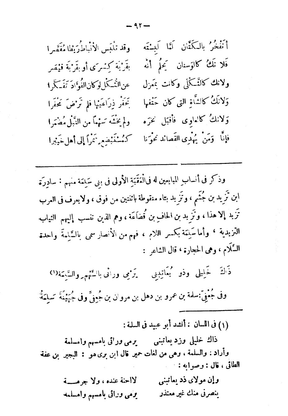 وَذَكَرَ فِي أَنْسَابِ الْمُبَايِعِينَ لَهُ فِي الْعَقَبَةِ الأولى فى بنى سلمة منهم: سادرة ابن تَزِيدَ بْنِ جُشَمَ، وَتَزِيدُ بِتَاءِ مَنْقُوطَةٍ بِاثْنَتَيْنِ مِنْ فَوْقُ، وَلَا يُعْرَفُ فِي الْعَرَبِ تَزِيدُ إلّا هَذَا، وَتَزِيدُ بْنُ الْحَافّ بْنِ قُضَاعَةَ، وَهُمْ الّذِينَ تُنْسَبُ إلَيْهِمْ الثّيَابُ التّزِيدِيّةُ، وَأَمّا سَلِمَةُ بِكَسْرِ اللّامِ، فَهُمْ مِنْ الْأَنْصَارِ سُمّيَ بِالسّلِمَةِ وَاحِدَةِ السّلَامِ، وَهِيَ الْحِجَارَةُ، قَالَ الشّاعِرُ:
