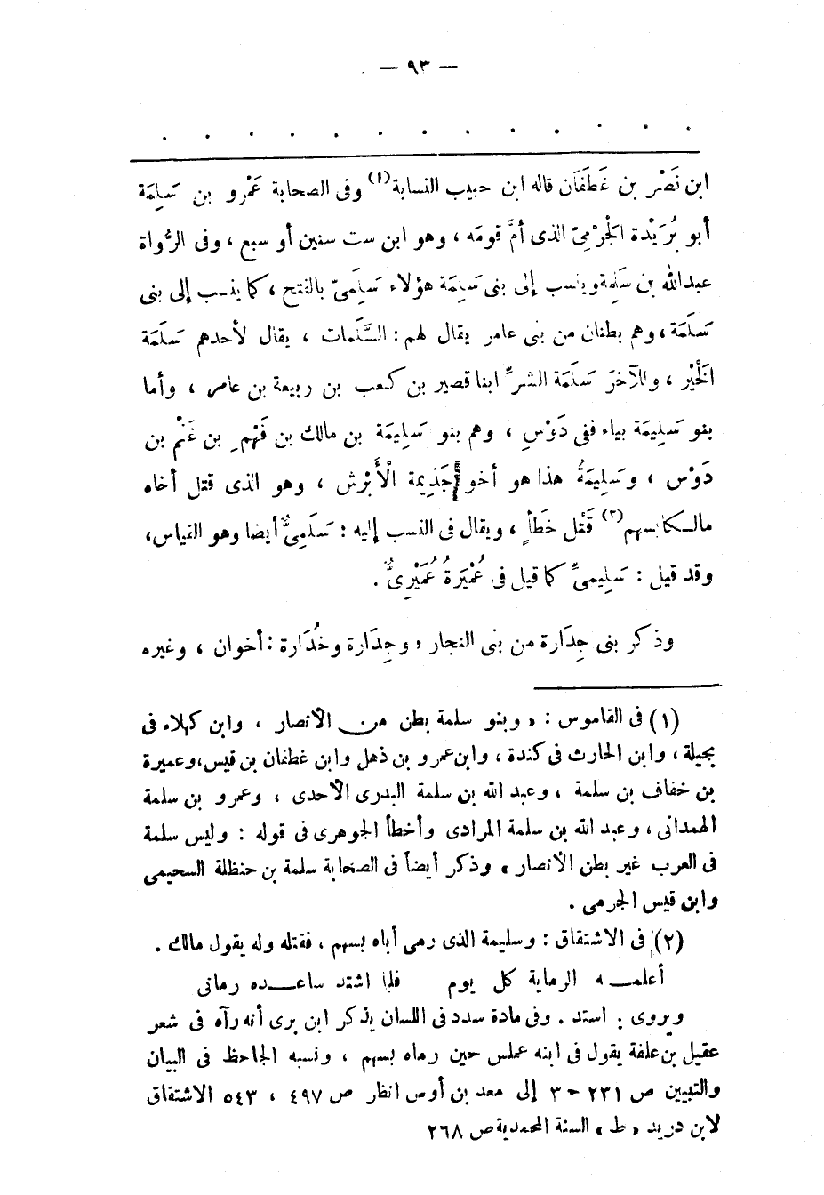 ابن نَصْرِ بْنِ غَطَفَانَ قَالَهُ ابْنُ حَبِيبٍ النّسّابَةُ «1» وفى الصّحَابَةِ عَمْرُو بْنُ سَلِمَةَ أَبُو بُرَيْدَةَ الْجَرْمِيّ الّذِي أَمّ قَوْمَهُ، وَهُوَ ابْنُ سِتّ سِنِينَ أَوْ سَبْعٍ، وَفِي الرّوَاةِ عَبْدُ اللهِ بْنُ سَلِمَةَ وَيُنْسَبُ إلَى بَنِي سَلِمَةَ هَؤُلَاءِ سَلَمِيّ بِالْفَتْحِ، كَمَا يُنْسَبُ إلَى بَنِي سَلَمَةَ، وَهُمْ بَطْنَانِ مِنْ بَنِي عَامِرٍ يُقَالُ لَهُمْ: السّلَمَاتُ، يُقَالُ لِأَحَدِهِمْ سَلَمَةُ الْخَيْرِ، وَلِلْآخَرِ سَلَمَةُ الشّرّ ابْنَا قَصِيرِ بْنِ كَعْبِ بْنِ رَبِيعَةَ بْنِ عَامِرٍ، وَأَمّا بَنُو سَلِيمَةَ بِيَاءِ فَفِي دَوْسٍ، وَهُمْ بَنُو سَلِيمَةَ بْنِ مَالِكِ بْنِ فَهْمِ بْنِ غَنْمِ بْنِ دَوْسٍ، وَسَلِيمَةُ هَذَا هُوَ أَخُو جَذِيمَةَ الْأَبْرَشِ، وَهُوَ الّذِي قَتَلَ أَخَاهُ مَالِكًا بِسَهْمِ «2» قَتْلَ خَطَأٍ، وَيُقَالُ فِي النّسَبِ إلَيْهِ: سَلَمِيّ أَيْضًا وَهُوَ الْقِيَاسُ، وَقَدْ قِيلَ: سُلَيْمِيّ كَمَا قِيلَ فِي عُمَيْرَةَ عُمَيْرِيّ.