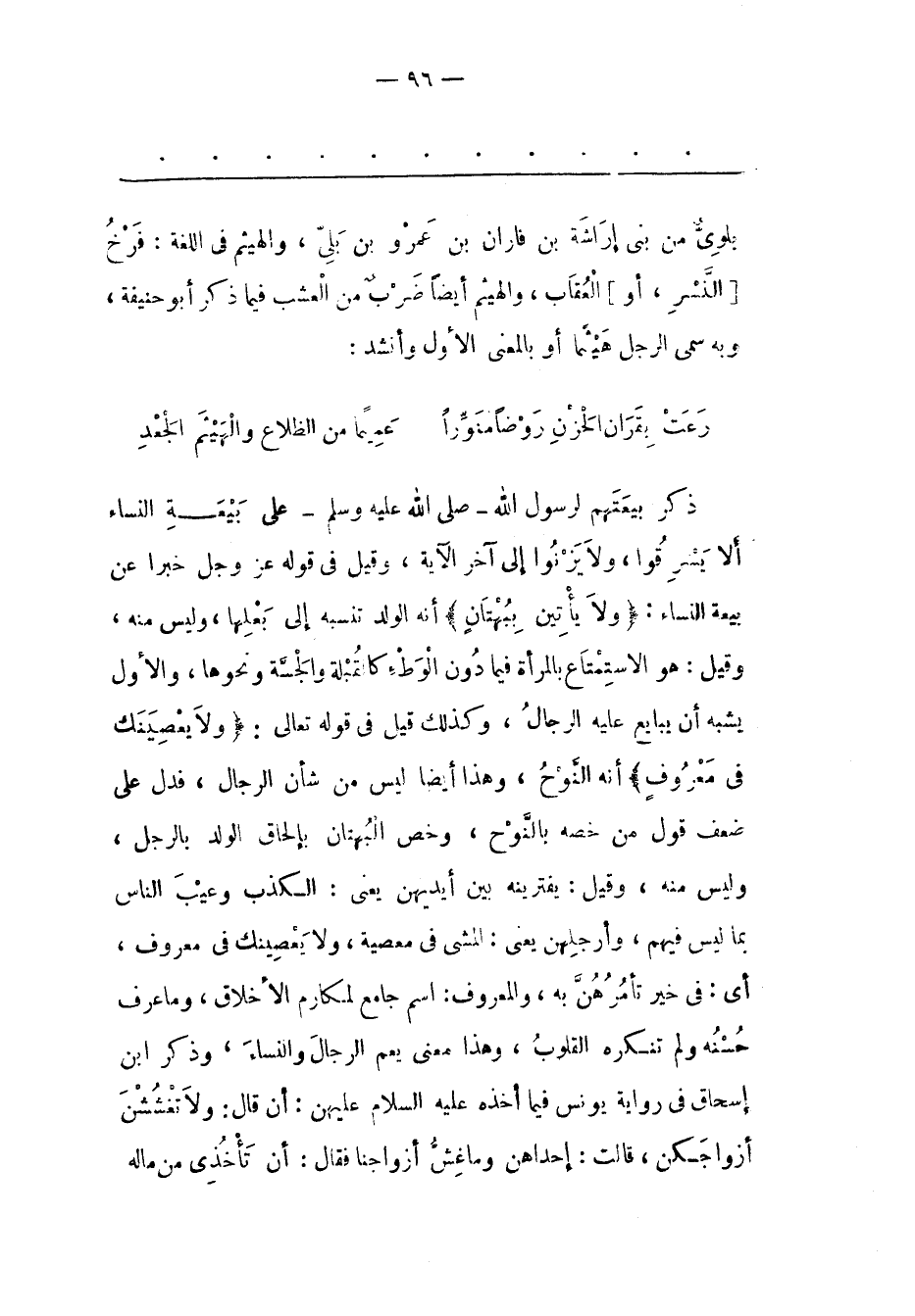 ذَكَرَ بَيْعَتَهُمْ لِرَسُولِ اللهِ- صَلَّى اللَّهُ عَلَيْهِ وَسَلَّمَ- عَلَى بَيْعَةِ النّسَاءِ أَلّا يَسْرِقُوا، وَلَا يَزْنُوا إلَى آخِرِ الْآيَةِ، وَقِيلَ فِي قَوْلِهِ عَزّ وَجَلّ خَبَرًا عَنْ بَيْعَةِ النساء: وَلا يَأْتِينَ بِبُهْتانٍ أَنّهُ الْوَلَدُ تَنْسُبُهُ إلَى بَعْلِهَا، وَلَيْسَ مِنْهُ، وَقِيلَ: هُوَ الِاسْتِمْتَاعُ بِالْمَرْأَةِ فِيمَا دُونَ الْوَطْءِ كَالْقُبْلَةِ وَالْجَسّةِ وَنَحْوِهَا، وَالْأَوّلُ يُشْبِهُ أَنْ يُبَايِعَ عَلَيْهِ الرّجَالُ، وَكَذَلِكَ قِيلَ فِي قَوْلِهِ تَعَالَى: وَلا يَعْصِينَكَ فِي مَعْرُوفٍ أنه النّوح، وهذا أيضا ليس مِنْ شَأْنِ الرّجَالِ، فَدَلّ عَلَى ضَعْفِ قَوْلِ مَنْ خَصّهُ بِالنّوْحِ، وَخَصّ الْبُهْتَانَ بِإِلْحَاقِ الْوَلَدِ بِالرّجُلِ، وَلَيْسَ مِنْهُ، وَقِيلَ: يَفْتَرِينَهُ بَيْنَ أَيْدِيهِنّ يَعْنِي: الْكَذِبَ وَعَيْبَ النّاسِ بِمَا لَيْسَ فِيهِمْ، وَأَرْجُلِهِنّ يَعْنِي: الْمَشْيَ فِي مَعْصِيَةٍ، وَلَا يَعْصِينَك فِي مَعْرُوفٍ، أَيْ: فِي خَيْرٍ تَأْمُرُهُنّ بِهِ، وَالْمَعْرُوفُ: اسْمٌ جَامِعٌ لِمَكَارِمِ الْأَخْلَاقِ، وَمَا عُرِفَ حُسْنُهُ وَلَمْ تُنْكِرْهُ الْقُلُوبُ، وَهَذَا مَعْنَى يَعُمّ الرّجَالَ وَالنّسَاءَ، وَذَكَرَ ابْنُ إسْحَاقَ فِي رِوَايَةِ يُونُسَ فِيمَا أَخَذَهُ عَلَيْهِ السّلَامُ عَلَيْهِنّ: أَنْ قَالَ: وَلَا تَغْشُشْنَ أَزْوَاجَكُنّ، قَالَتْ: إحْدَاهُنّ وَمَا غِشّ أَزْوَاجِنَا فَقَالَ: أَنْ تَأْخُذِي مِنْ مَالِهِ