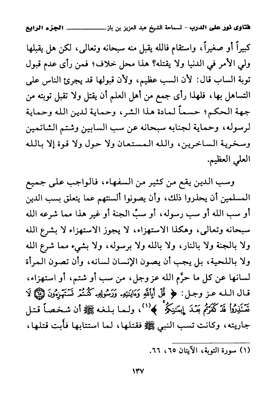 وسب الدين يقع من كثير من السفهاء، فالواجب على جميع المسلمين أن يحذروا ذلك، وأن يصونوا ألسنتهم عما يتعلق بسب الدين أو سب الله أو سب رسوله، أو سب الجنة أو غير هذا مما شرعه سبحانه وتعالى، وهكذا الاستهزاء، لا يجوز الاستهزاء لا بشرع الله ولا بالجنة ولا بالنار، ولا بالله ولا برسوله، ولا بشيء مما شرع الله ولا باللحية، بل يجب أن يصون الإنسان لسانه، وأن تصون المرأة لسانها عن كل ما حرم الله عز وجل، من سب أو شتم، أو استهزاء، قال الله عز وجل: {قُلْ أَبِاللَّهِ وَآيَاتِهِ وَرَسُولِهِ كُنْتُمْ تَسْتَهْزِئُونَ} (¬1) {لَا تَعْتَذِرُوا قَدْ كَفَرْتُمْ بَعْدَ إِيمَانِكُمْ} (¬2)، ولما بلغه صلى الله عليه وسلم أن شخصا قتل جاريته، وكانت تسب النبي صلى الله عليه وسلم فقتلها، لما استتابها فأبت قتلها،