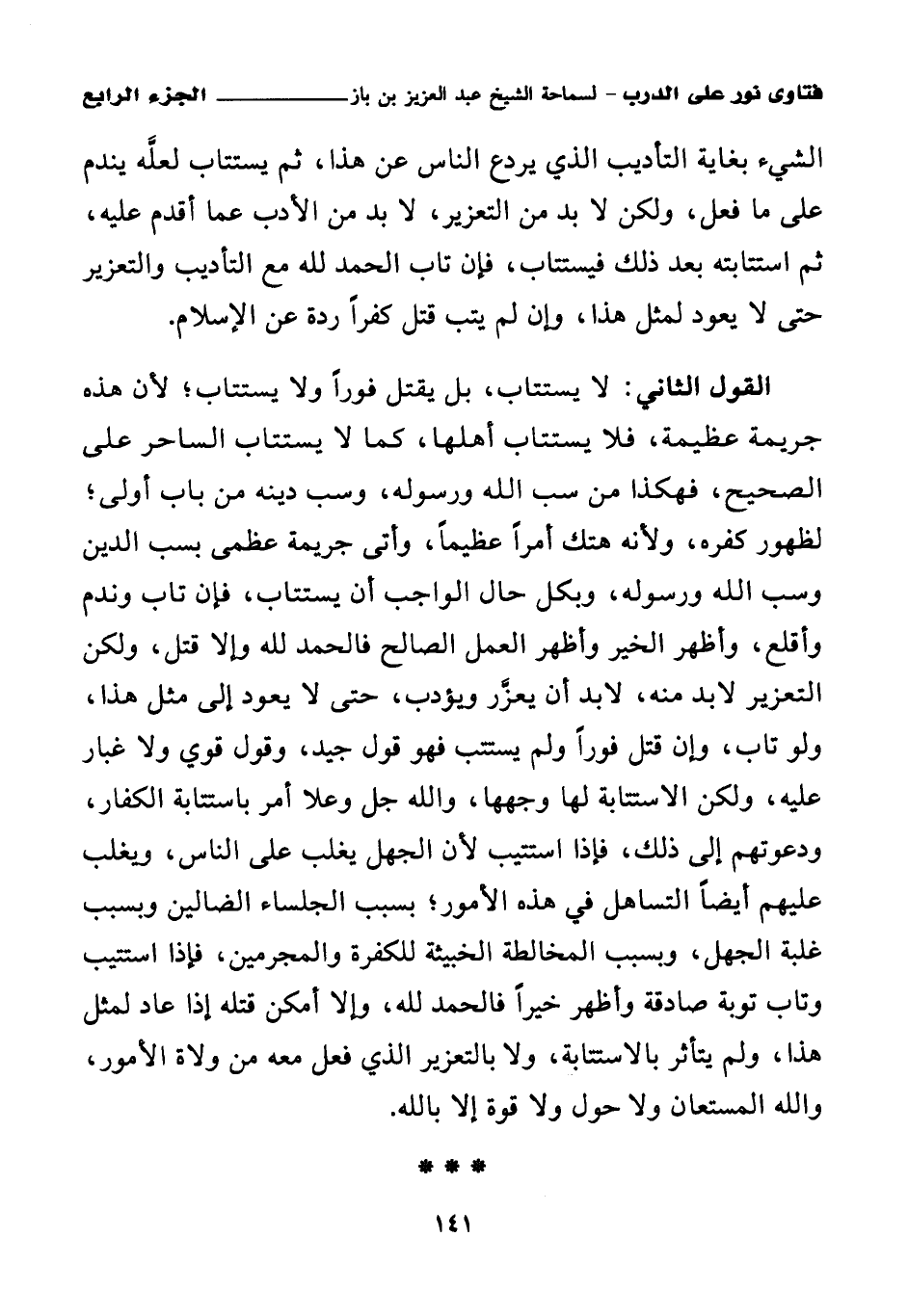 القول الثاني: لا يستتاب، بل يقتل فورا، ولا يستتاب؛ لأن هذه جريمة عظيمة، فلا يستتاب أهلها، كما لا يستتاب الساحر على الصحيح، فهكذا من سب الله ورسوله، وسب دينه من باب أولى، لظهور كفره، ولأنه هتك أمرا عظيما، وأتى جريمة عظمى بسب الدين وسب الله ورسوله، وبكل حال الواجب أن يستتاب، فإن تاب وندم وأقلع، وأظهر الخير وأظهر العمل الصالح فالحمد لله وإلا قتل، ولكن التعزير لا بد منه، لا بد أن يعزر ويؤدب، حتى لا يعود إلى مثل هذا، ولو تاب، وإن قتل فورا ولم يستتب فهو قول جيد، وقول قوي ولا غبار عليه، ولكن الاستتابة لها وجهها، والله جل وعلا أمر باستتابة الكفار، ودعوتهم إلى ذلك، فإذا استتيب لأن الجهل يغلب على الناس، ويغلب عليهم أيضا التساهل في هذه الأمور، بسبب الجلساء الضالين وبسبب غلبة الجهل، وبسبب المخالطة الخبيثة للكفرة والمجرمين، فإذا استتيب وتاب توبة صادقة وأظهر خيرا فالحمد لله، وإلا أمكن قتله إذا عاد لمثل هذا، ولم يتأثر بالاستتابة، ولا بالتعزير الذي فعل معه من ولاة الأمور، والله المستعان ولا حول ولا قوة إلا بالله.