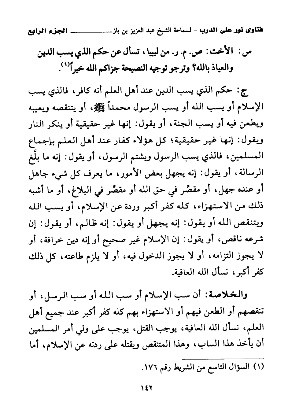 والخلاصة: أن سب الإسلام أو سب الله أو سب الرسل، أو تنقصهم أو الطعن فيهم أو الاستهزاء بهم كله كفر أكبر عند جميع أهل العلم، نسأل الله العافية، يوجب القتل، يوجب على ولي أمر المسلمين أن يأخذ هذا الساب، وهذا المتنقص ويقتله على ردته عن الإسلام، أما