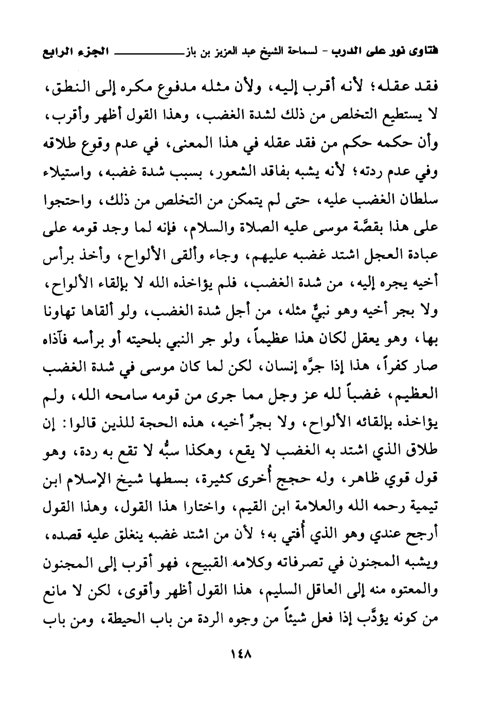 فقد عقله؛ لأنه أقرب إليه، ولأن مثله مدفوع مكره إلى النطق، لا يستطيع التخلص من ذلك لشدة الغضب، وهذا القول أظهر وأقرب، وأن حكمه حكم من فقد عقله في هذا المعنى، في عدم وقوع طلاقه وفي عدم ردته، لأنه يشبه بفاقد الشعور، بسبب شدة غضبه، واستيلاء سلطان الغضب عليه، حتى لم يتمكن من التخلص من ذلك، واحتجوا على هذا بقصة موسى عليه الصلاة والسلام، فإنه لما وجد قومه على عبادة العجل اشتد غضبه عليهم، وجاء وألقى الألواح، وأخذ برأس أخيه يجره إليه، من شدة الغضب، فلم يؤاخذه الله لا بإلقاء الألواح، ولا بجر أخيه وهو نبي مثله، من أجل شدة الغضب، ولو ألقاها تهاونا بها، وهو يعقل لكان هذا عظيما، ولو جر النبي بلحيته أو برأسه فآذاه صار كفرا، هذا إذا جره إنسان، لكن لما كان موسى في شدة الغضب العظيم، غضبا لله عز وجل مما جرى من قومه سامحه الله، ولم يؤاخذه بإلقائه الألواح، ولا بجر أخيه، هذه الحجة للذين قالوا: إن طلاق الذي اشتد به الغضب لا يقع، وهكذا سبه لا تقع به ردة، وهو قول قوي ظاهر، وله حجج أخرى كثيرة، بسطها شيخ الإسلام ابن تيمية رحمه الله والعلامة ابن القيم، واختارا هذا القول، وهذا القول أرجح عندي وهو الذي أفتي به؛ لأن من اشتد غضبه ينغلق عليه قصده، ويشبه المجنون في تصرفاته وكلامه القبيح، فهو أقرب إلى المجنون والمعتوه منه إلى العاقل السليم، هذا القول أظهر وأقوى، لكن لا مانع من كونه يؤدب إذا فعل شيئا من وجوه الردة من باب الحيطة، ومن باب