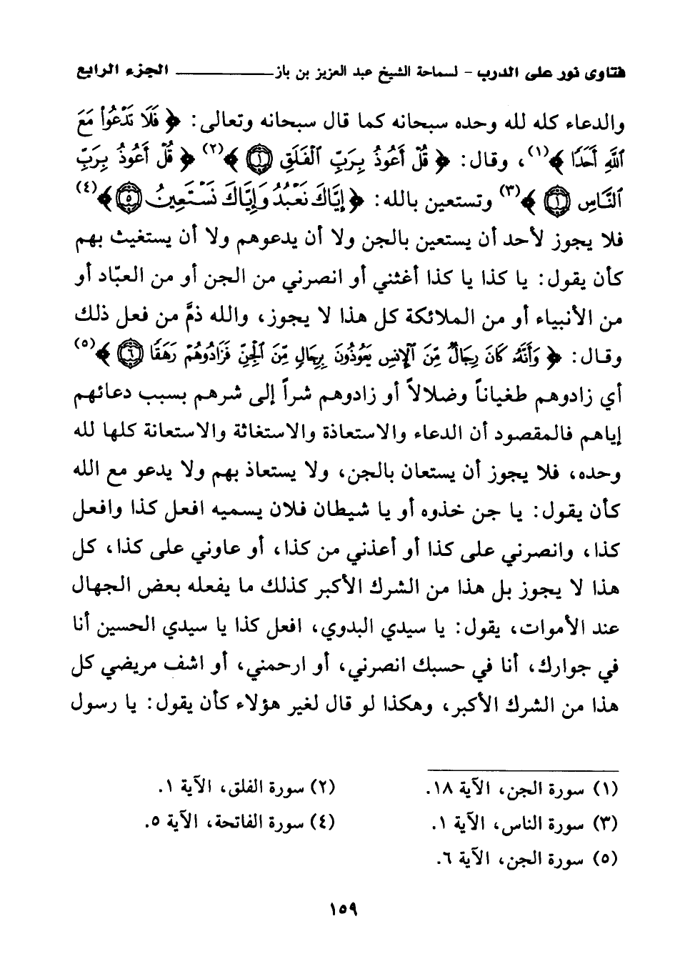 والدعاء كله لله وحده سبحانه كما قال سبحانه وتعالى: {فَلَا تَدْعُوا مَعَ اللَّهِ أَحَدًا} (¬1)، وقال: {قُلْ أَعُوذُ بِرَبِّ الْفَلَقِ} (¬2) {قُلْ أَعُوذُ بِرَبِّ النَّاسِ} (¬3) وتستعين بالله: {إِيَّاكَ نَعْبُدُ وَإِيَّاكَ نَسْتَعِينُ} (¬4) فلا يجوز لأحد أن يستعين بالجن ولا أن يدعوهم ولا أن يستغيث بهم كأن يقول: يا كذا يا كذا أغثني أو انصرني من الجن أو من العباد أو من الأنبياء أو من الملائكة كل هذا لا يجوز، والله ذم من فعل ذلك وقال: {وَأَنَّهُ كَانَ رِجَالٌ مِنَ الْإِنْسِ يَعُوذُونَ بِرِجَالٍ مِنَ الْجِنِّ فَزَادُوهُمْ رَهَقًا} (¬5) أي زادوهم طغيانا وضلالا أو زادوهم شرا إلى شرهم بسبب دعائهم إياهم فالمقصود أن الدعاء والاستعاذة والاستغاثة والاستعانة كلها لله وحده، فلا يجوز أن يستعان بالجن، ولا يستعاذ بهم ولا يدعو مع الله كأن يقول: يا جن خذوه أو يا شيطان فلان يسميه افعل كذا وافعل كذا، وانصرني على كذا أو أعذني من كذا، أو عاوني على كذا، كل هذا لا يجوز بل هذا من الشرك الأكبر كذلك ما يفعله بعض الجهال عند الأموات، يقول: يا سيدي البدوي، افعل كذا يا سيدي الحسين أنا في جوارك، أنا في حسبك انصرني، أو ارحمني، أو اشف مريضي كل هذا من الشرك الأكبر، وهكذا لو قال لغير هؤلاء كأن يقول: يا رسول