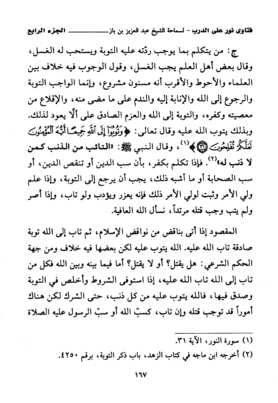 ج: من يتكلم بما يوجب ردته عليه التوبة ويستحب له الغسل، وقال بعض أهل العلم يجب الغسل، وقول الوجوب فيه خلاف بين العلماء، والأحوط والأقرب أنه مسنون مشروع، وإنما الواجب التوبة والرجوع إلى الله والإنابة إليه والندم على ما مضى منه، والإقلاع من معصيته وكفره، والتوبة إلى الله والعزم الصادق على ألا يعود لذلك. وبذلك يتوب الله عليه، وقال تعالى: {وَتُوبُوا إِلَى اللَّهِ جَمِيعًا أَيُّهَا الْمُؤْمِنُونَ لَعَلَّكُمْ تُفْلِحُونَ} (¬1)، وقال النبي صلى الله عليه وسلم: «التائب من الذنب كمن لا ذنب له (¬2)». فإذا تكلم بكفر، بأن سب الدين أو تنقص الدين، أو سب الصحابة أو ما أشبه ذلك، يجب أن يرجع إلى التوبة، وإذا علم ولي الأمر وثبت لولي الأمر ذلك، فإنه يعزر ويؤدب ولو تاب، وإذا أصر ولم يتب وجب قتله مرتدا، نسأل الله العافية.