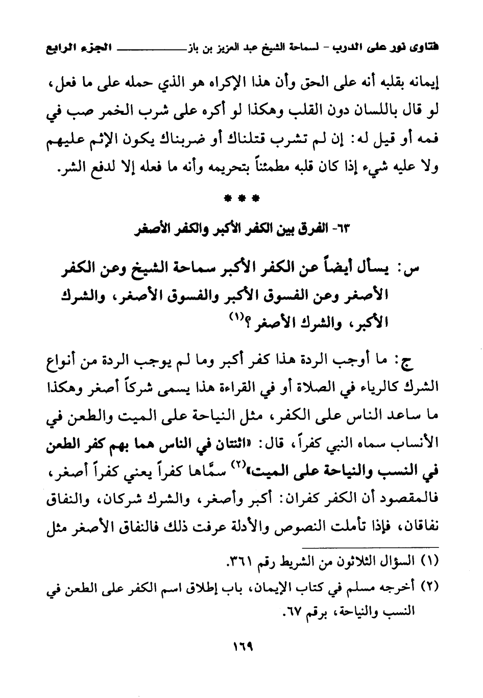 س: يسأل أيضا عن الكفر الأكبر - سماحة الشيخ - وعن الكفر الأصغر، وعن الفسوق الأكبر والفسوق الأصغر، والشرك الأكبر، والشرك الأصغر؟ (¬1)