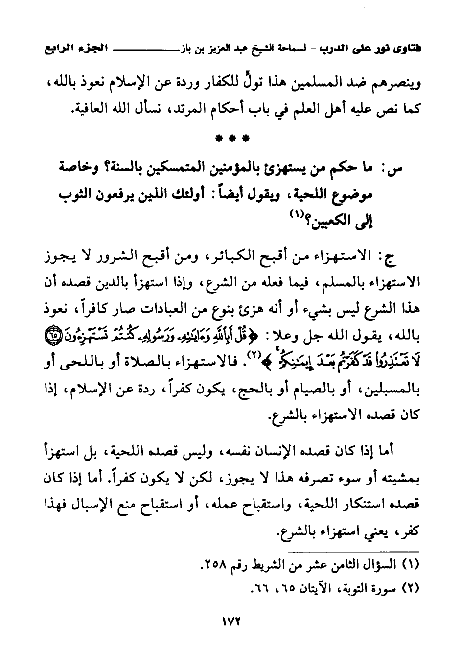 ج: الاستهزاء من أقبح الكبائر، ومن أقبح الشرور، لا يجوز الاستهزاء بالمسلم، فيما فعله من الشرع، وإذا استهزأ بالدين قصده أن هذا الشرع ليس بشيء أو أنه هزئ بنوع من العبادات صار كافرا، نعوذ بالله، يقول الله جل وعلا: {قُلْ أَبِاللَّهِ وَآيَاتِهِ وَرَسُولِهِ كُنْتُمْ تَسْتَهْزِئُونَ لَا تَعْتَذِرُوا قَدْ كَفَرْتُمْ بَعْدَ إِيمَانِكُمْ} (¬2) فالاستهزاء بالصلاة أو باللحى أو غير المسبلين، أو بالصيام أو بالحج، يكون كفرا، ردة عن الإسلام، إذا كان قصده الاستهزاء بالشرع.