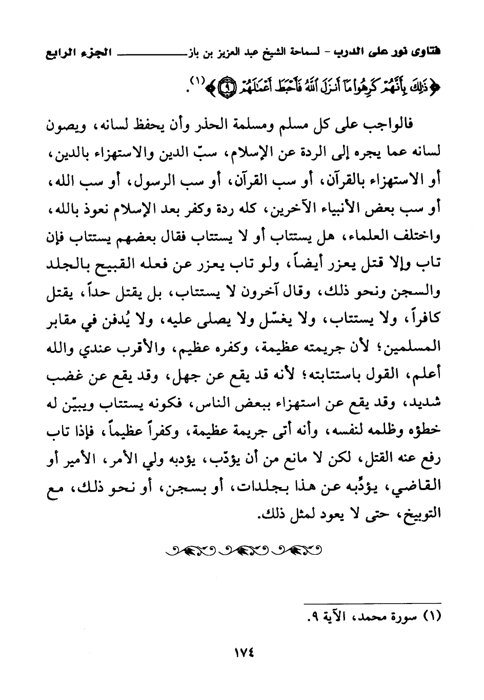 فالواجب على كل مسلم ومسلمة الحذر وأن يحفظ لسانه، ويصون لسانه عما يجره إلى الردة عن الإسلام، سب الدين والاستهزاء بالدين، أو الاستهزاء بالقرآن، أو سب القرآن، أو سب الرسول، أو سب الله، أو سب بعض الأنبياء الآخرين، كله ردة وكفر بعد الإسلام نعوذ بالله، واختلف العلماء، هل يستتاب أو لا يستتاب، فقال بعضهم: يستتاب فإن تاب وإلا قتل، يعزر أيضا، ولو تاب يعزر عن فعله القبيح بالجلد والسجن ونحو ذلك، وقال آخرون: لا يستتاب، بل يقتل حدا، يقتل كافرا، ولا يستتاب، ولا يغسل ولا يصلى عليه، ولا يدفن في مقابر المسلمين، لأن جريمته عظيمة، وكفره عظيم، والأقرب عندي والله أعلم القول باستتابته، لأنه قد يقع عن جهل، وقد يقع عن غضب شديد، وقد يقع عن استهزاء ببعض الناس، فكونه يستتاب ويبين له خطؤه وظلمه لنفسه، وأنه أتى جريمة عظيمة، وكفرا عظيما، فإذا تاب رفع عنه القتل، لكن لا مانع من أن يؤدب، يؤدبه ولي الأمر، الأمير أو القاضي، يؤدبه عن هذا بجلدات، أو بسجن، أو نحو ذلك، مع التوبيخ، حتى لا يعود لمثل ذلك.