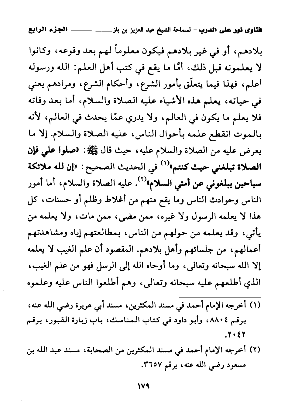 بلادهم، أو في غير بلادهم فيكون معلوما لهم بعد وقوعه، وكانوا لا يعلمونه قبل ذلك، أما ما يقع في كتب أهل العلم: الله ورسوله أعلم، فهذا فيما يتعلق بأمور الشرع، وأحكام الشرع، ومرادهم يعني في حياته، يعلم هذه الأشياء عليه الصلاة والسلام، أما بعد وفاته فلا يعلم ما يكون في العالم، ولا يدري عما يحدث في العالم، لأنه بالموت انقطع علمه بأحوال الناس، عليه الصلاة والسلام، إلا ما يعرض عليه من الصلاة والسلام عليه، حيث قال صلى الله عليه وسلم: «صلوا علي فإن الصلاة تبلغني حيث كنتم (¬1)» في الحديث الصحيح: «إن لله ملائكة سياحين يبلغوني عن أمتي السلام (¬2)». عليه الصلاة والسلام، أما أمور الناس وحوادث الناس وما يقع منهم من أغلاط وظلم أو حسنات، كل هذا لا يعلمه الرسول ولا غيره، ممن مضى، ممن مات، ولا يعلمه من يأتي، وقد يعلمه من حولهم من الناس، بمطالعتهم إياه ومشاهدتهم أعمالهم، من جلسائهم وأهل بلادهم. المقصود أن علم الغيب لا يعلمه إلا الله سبحانه وتعالى، وما أوحاه الله إلى الرسل فهو من علم الغيب، الذي أطلعهم عليه سبحانه وتعالى، وهم أطلعوا الناس عليه وعلموه
