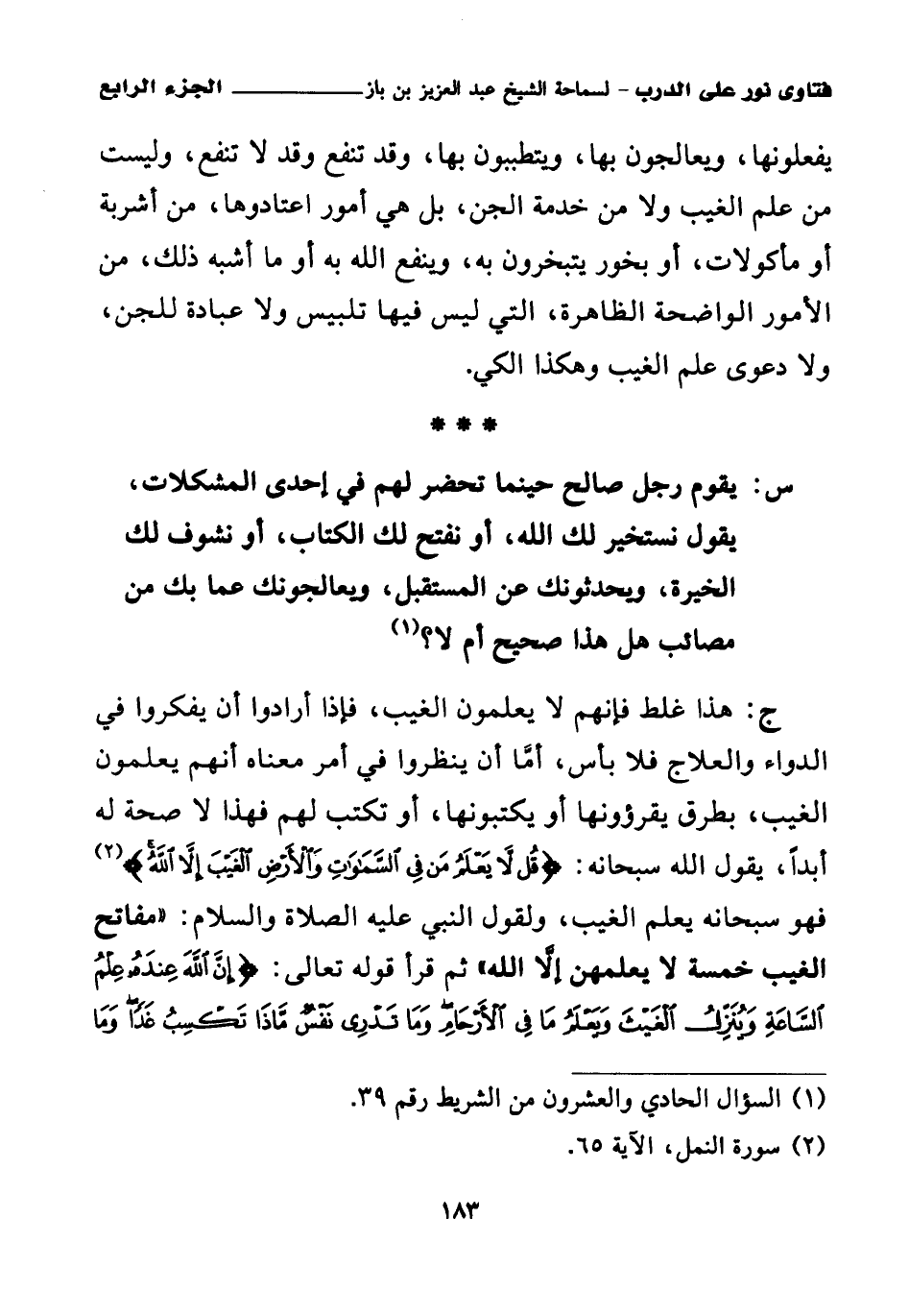 ج: هذا غلط فإنهم لا يعلمون الغيب، فإذا أرادوا أن يفكروا في الدواء والعلاج فلا بأس، أما أن ينظروا في أمر معناه أنهم يعلمون الغيب، بطريق يقرءونها أو يكتبونها، أو تكتب لهم فهذا لا صحة له أبدا، يقول الله سبحانه: {قُلْ لَا يَعْلَمُ مَنْ فِي السَّمَاوَاتِ وَالْأَرْضِ الْغَيْبَ إِلَّا اللَّهُ} (¬2) فهو سبحانه يعلم الغيب، ولقول النبي عليه الصلاة والسلام: «مفاتح الغيب خمسة لا يعلمهن إلا الله، ثم قرأ قوله تعالى: (¬4)»
