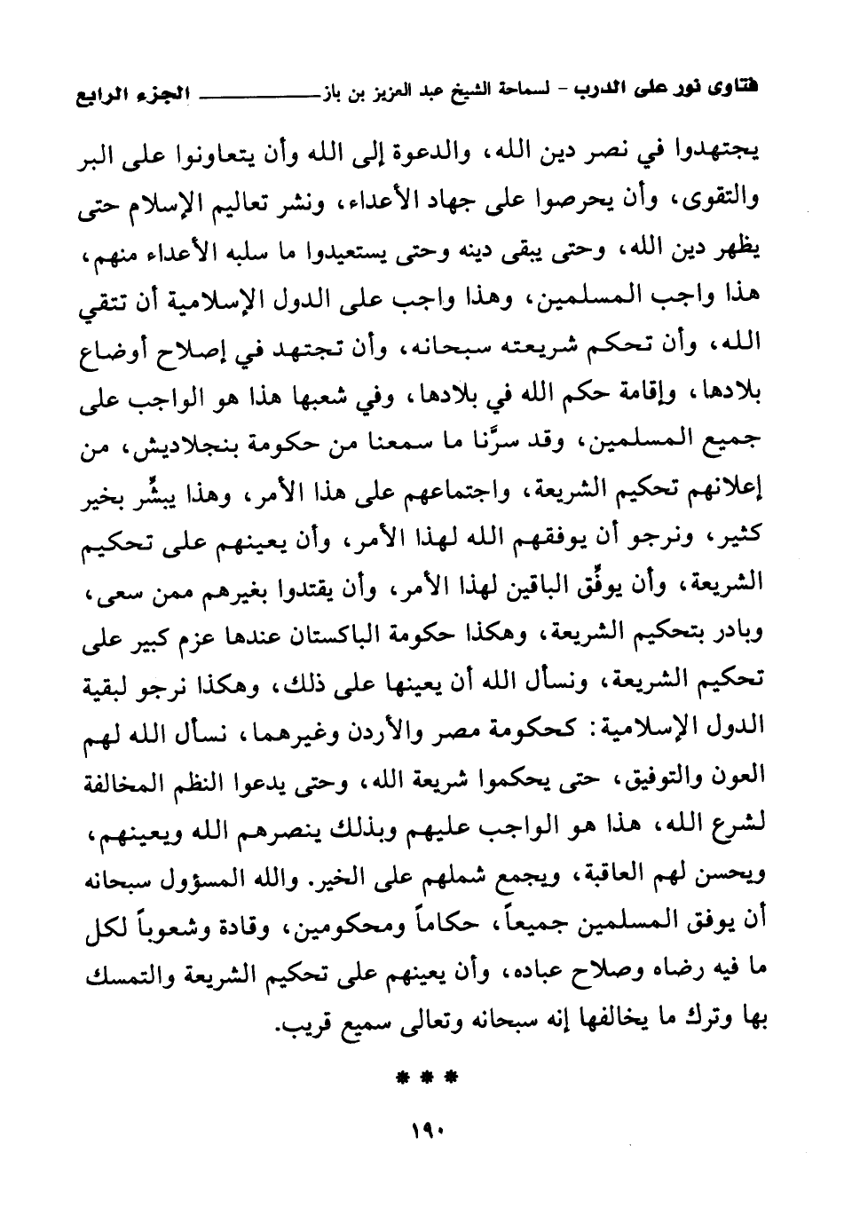 يجتهدوا في نصر دين الله، والدعوة إلى الله، وأن يتعاونوا على البر والتقوى، وأن يحرصوا على جهاد الأعداء، ونشر تعاليم الإسلام حتى يظهر دين الله، وحتى يبقى دينه، وحتى يستعيدوا ما سلبه الأعداء منهم، هذا واجب المسلمين، وهذا واجب على الدول الإسلامية أن تتقي الله، وأن تحكم شريعته سبحانه، وأن تجتهد في إصلاح أوضاع بلادها، وإقامة حكم الله في بلادها، وفي شعبها، هذا هو الواجب على جميع المسلمين، وقد سرنا ما سمعنا من حكومة بنجلاديش، من إعلانهم تحكيم الشريعة، واجتماعهم على هذا الأمر، وهذا يبشر بخير كثير، ونرجو أن يوفقهم الله لهذا الأمر، وأن يعينهم على تحكيم الشريعة، وأن يوفق الباقين لهذا الأمر، وأن يقتدوا بغيرهم ممن سعى، وبادر بتحكيم الشريعة، وهكذا حكومة الباكستان عندها عزم كبير على تحكيم الشريعة، ونسأل الله أن يعينها على ذلك، وهكذا نرجو لبقية الدول الإسلامية: كحكومة مصر والأردن وغيرها، نسأل الله لهم العون والتوفيق، حتى يحكموا شريعة الله، وحتى يدعوا النظم المخالفة لشرع الله، هذا هو الواجب عليهم وبذلك ينصرهم الله ويعينهم، ويحسن لهم العاقبة، ويجمع شملهم على الخير. والله المسئول سبحانه أن يوفق المسلمين جميعا، حكاما ومحكومين، وقادة وشعوبا لكل ما فيه رضاه وصلاح عباده، وأن يعينهم على تحكيم الشريعة والتمسك بها، وترك ما يخالفها، إنه سبحانه وتعالى سميع قريب.
