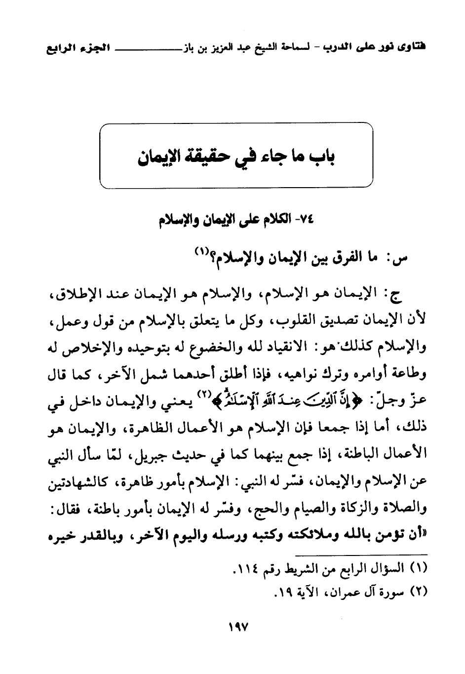 ج: الإيمان هو الإسلام، والإسلام هو الإيمان عند الإطلاق، لأن الإيمان تصديق القلوب، وكل ما يتعلق بالإسلام من قول وعمل، والإسلام كذلك هو: الانقياد لله والخضوع له بتوحيده والإخلاص له وطاعة أوامره وترك نواهيه، فإذا أطلق أحدهما شمل الآخر، كما قال عز وجل: {إِنَّ الدِّينَ عِنْدَ اللَّهِ الْإِسْلَامُ} (¬2) يعني والإيمان داخل في ذلك، أما إذا جمعا فإن الإسلام هو الأعمال الظاهرة، والإيمان هو الأعمال الباطنة، إذا جمع بينهما كما في حديث جبريل، لما سأل النبي عن الإسلام والإيمان، فسر له النبي الإسلام بأمور ظاهرة، كالشهادتين والصلاة والزكاة والصيام والحج، وفسر له الإيمان بأمور باطنة، فقال: «أن تؤمن بالله وملائكته وكتبه ورسله واليوم الآخر، وبالقدر خيره