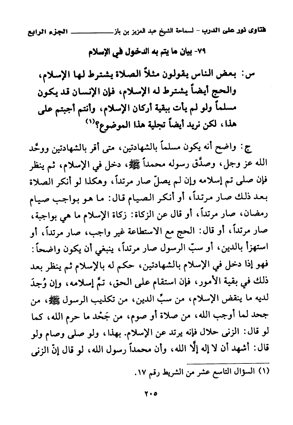 س: بعض الناس يقولون مثلا الصلاة يشترط لها الإسلام، والحج أيضا يشترط له الإسلام، فإن الإنسان قد يكون مسلما ولو لم يأت ببقية أركان الإسلام، وأنتم أجبتم على هذا، لكن نريد أيضا تجلية هذا الموضوع؟ (¬1)