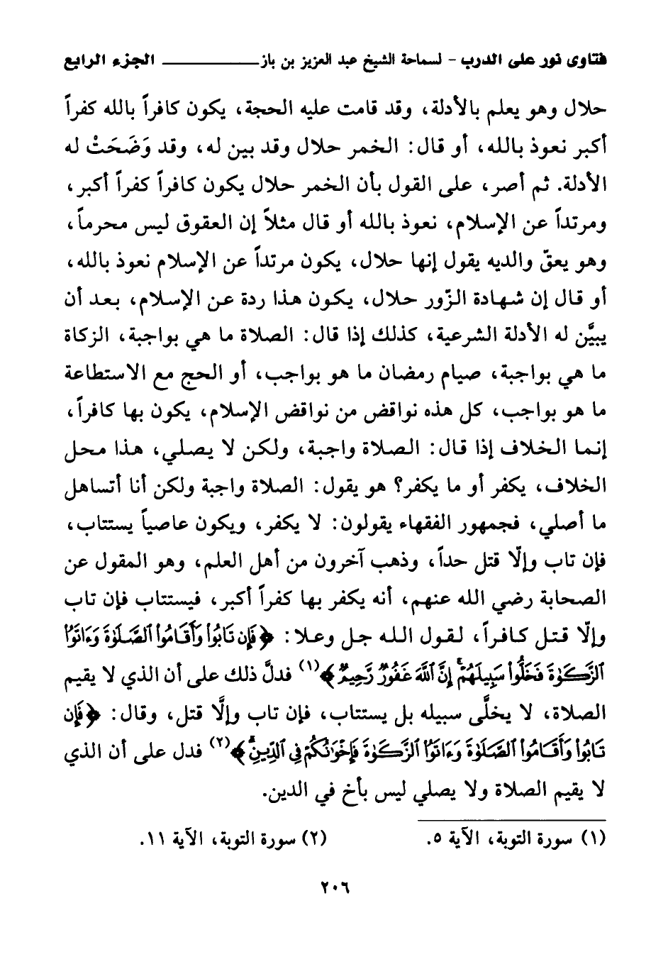 حلال وهو يعلم بالأدلة، وقد قامت عليه الحجة، يكون كافرا بالله كفرا أكبر نعوذ بالله، أو قال: الخمر حلال وقد بين له، وقد وضحت له الأدلة ثم أصر على القول بأن الخمر حلال يكون كافرا كفرا أكبر، ومرتدا عن الإسلام، نعوذ بالله أو قال مثلا أن العقوق ليس محرما، وهو يعق والديه يقول إنها حلال، يكون مرتدا عن الإسلام نعوذ بالله، أو قال إن شهادة الزور حلال، يكون هذا ردة عن الإسلام، بعد أن يبين له الأدلة الشرعية، كذلك إذا قال: الصلاة ما هي بواجبة، الزكاة ما هي بواجبة، صيام رمضان ما هو بواجب، أو الحج مع الاستطاعة ما هو بواجب، كل هذه نواقض من نواقض الإسلام، يكون بها كافرا، إنما الخلاف إذا قال: الصلاة واجبة، ولكن لا يصلي، هذا محل الخلاف، يكفر أو ما يكفر؟ هو يقول: الصلاة واجبة ولكن أنا أتساهل ما أصلي، فجمهور الفقهاء يقولون: لا يكفر، ويكون عاصيا يستتاب، فإن تاب وإلا قتل حدا، وذهب آخرون من أهل العلم، وهو المقول عن الصحابة رضي الله عنهم، أنه يكفر بها كفرا أكبر، فيستتاب، فإن تاب وإلا قتل كافرا، لقول الله جل وعلا: {فَإِنْ تَابُوا وَأَقَامُوا الصَّلَاةَ وَآتَوُا الزَّكَاةَ فَخَلُّوا سَبِيلَهُمْ إِنَّ اللَّهَ غَفُورٌ رَحِيمٌ} (¬1)، فدل ذلك على أن الذي لا يقيم الصلاة، لا يخلي سبيله بل يستتاب، فإن تاب وإلا قتل، وقال: {فَإِنْ تَابُوا وَأَقَامُوا الصَّلَاةَ وَآتَوُا الزَّكَاةَ فَإِخْوَانُكُمْ فِي الدِّينِ} (¬2)، فدل على أن الذي لا يقيم الصلاة ولا يصلي ليس بأخ في الدين.