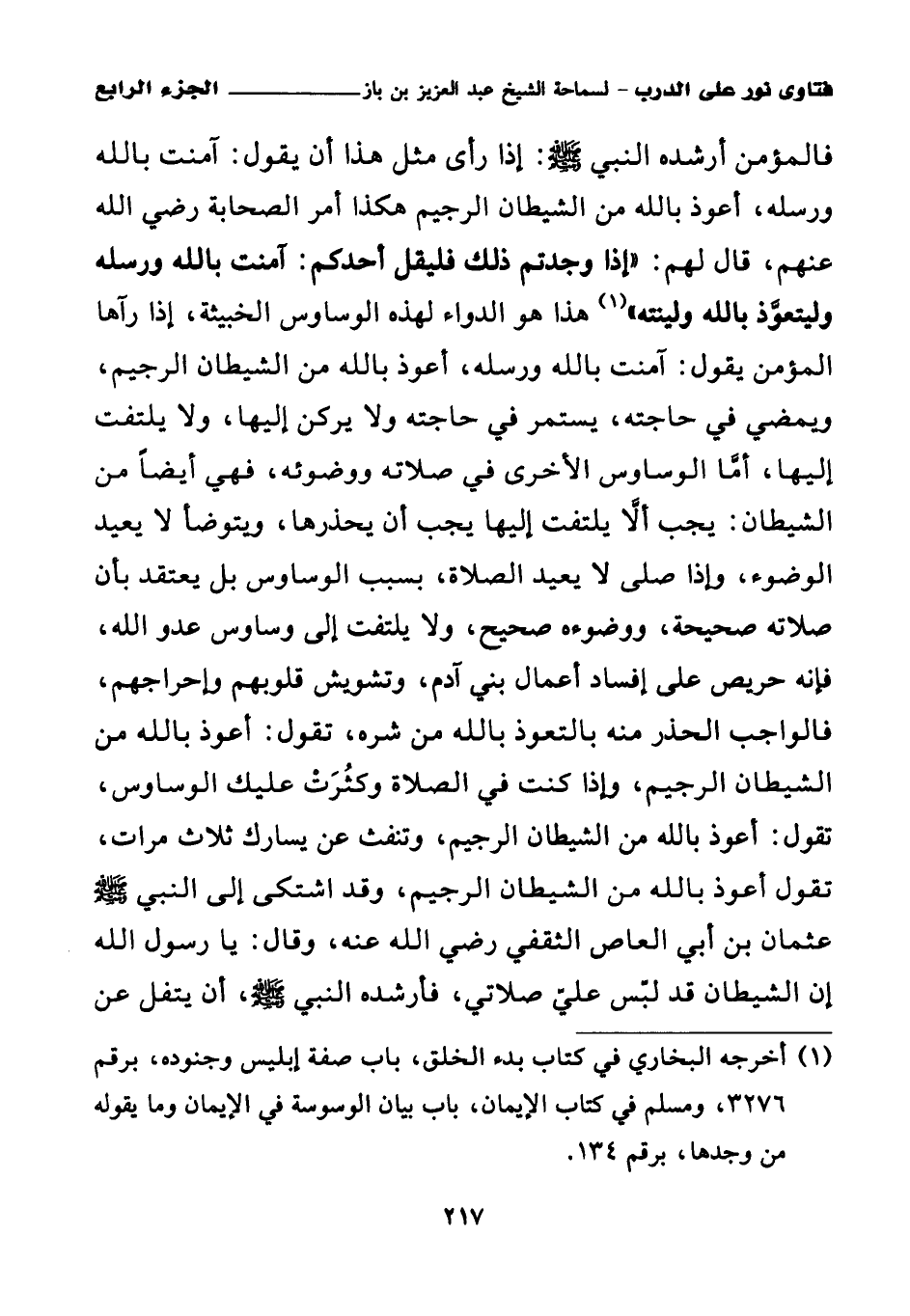 فالمؤمن أرشده النبي صلى الله عليه وسلم: إذا رأى مثل هذا أن يقول: آمنت بالله ورسله، أعوذ بالله من الشيطان الرجيم، هكذا أمر الصحابة رضي الله عنهم، قال لهم: «إذا وجدتم ذلك فليقل أحدكم: آمنت بالله ورسله وليتعوذ بالله ولينته (¬1)»، هذا هو الدواء لهذا الوساوس الخبيثة، إذا رآها المؤمن يقول: آمنت بالله ورسله، أعوذ بالله من الشيطان الرجيم، ويمضي في حاجته، يستمر في حاجته ولا يركن إليها، ولا يلتفت إليها، أما الوساوس الأخرى في صلاته ووضوئه، فهي أيضا من الشيطان يجب ألا يلتفت إليها يجب أن يحذرها، ويتوضأ لا يعيد الوضوء، وإذا صلى لا يعيد الصلاة، بسبب الوساوس، بل يعتقد بأن صلاته صحيحة، ووضوءه صحيح، ولا يلتفت إلى وساوس عدو الله، فإنه حريص على إفساد أعمال بني آدم، وتشويش قلوبهم وإحراجهم، فالواجب الحذر منه بالتعوذ بالله من شره، تقول: أعوذ بالله من الشيطان الرجيم، وإذا كنت في الصلاة وكثرت عليك الوساوس، تقول: أعوذ بالله من الشيطان الرجيم، وتنفث عن يسارك ثلاث مرات، تقول: أعوذ بالله من الشيطان الرجيم، وقد اشتكى إلى النبي صلى الله عليه وسلم عثمان بن أبي العاص الثقفي رضي الله عنه، وقال: يا رسول الله إن الشيطان قد لبس علي صلاتي، فأرشده النبي صلى الله عليه وسلم أن يتفل عن