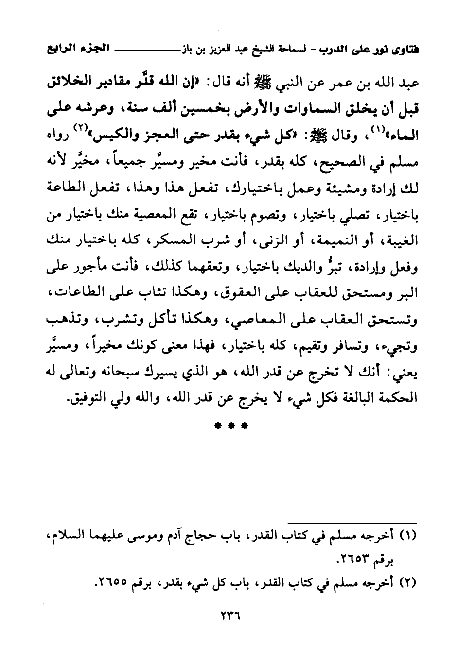 عبد الله بن عمر عن النبي صلى الله عليه وسلم أنه قال: «إن الله قدر مقادير الخلائق قبل أن يخلق السماوات والأرض بخمسين ألف سنة، وعرشه على الماء (¬1)»، وقال صلى الله عليه وسلم: «كل شيء بقدر حتى العجز والكيس (¬2)» رواه مسلم في الصحيح، كله بقدر، فأنت مخير ومسير جميعا، مخير لأنه لك إرادة ومشيئة وعمل باختيارك، تفعل هذا وهذا، تفعل الطاعة باختيار، تصلي باختيار، وتصوم باختيار، تقع المعصية منك باختيار من الغيبة، أو النميمة، أو الزنى، أو شرب المسكر، كله باختيار منك وفعل وإرادة، تبر والديك باختيار، وتعقهما كذلك، فأنت مأجور على البر ومستحق للعقاب على العقوق، وهكذا تثاب على الطاعات، وتستحق العقاب على المعاصي، وهكذا تأكل وتشرب، وتذهب وتجيء، وتسافر وتقيم، كله باختيار، فهذا معنى كونك مخيرا، ومسير يعني: أنك لا تخرج عن قدر الله، هو الذي يسيرك سبحانه وتعالى له الحكمة البالغة فكل شيء لا يخرج عن قدر الله، والله ولي التوفيق.