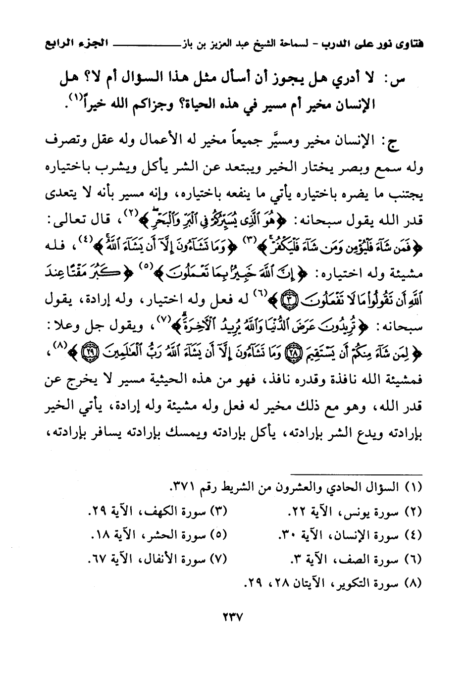 ج: الإنسان مخير ومسير جميعا؛ مخير له الأعمال وله عقل وتصرف وله سمع وبصر يختار الخير ويبتعد عن الشر يأكل ويشرب باختياره، يجتنب ما يضره باختياره يأتي ما ينفعه باختياره، وإنه مسير بأنه لا يتعدى قدر الله يقول سبحانه: {هُوَ الَّذِي يُسَيِّرُكُمْ فِي الْبَرِّ وَالْبَحْرِ} (¬2)، قال تعالى: {فَمَنْ شَاءَ فَلْيُؤْمِنْ وَمَنْ شَاءَ فَلْيَكْفُرْ} (¬3)، {وَمَا تَشَاءُونَ إِلَّا أَنْ يَشَاءَ اللَّهُ} (¬4)، فله مشيئة وله اختياره: {إِنَّ اللَّهَ خَبِيرٌ بِمَا تَعْمَلُونَ} (¬5)، {كَبُرَ مَقْتًا عِنْدَ اللَّهِ أَنْ تَقُولُوا مَا لَا تَفْعَلُونَ} (¬6)، له فعل وله اختيار، وله إرادة، يقول سبحانه: {تُرِيدُونَ عَرَضَ الدُّنْيَا وَاللَّهُ يُرِيدُ الْآخِرَةَ} (¬7)، ويقول جل وعلا: {لِمَنْ شَاءَ مِنْكُمْ أَنْ يَسْتَقِيمَ} (¬8) {وَمَا تَشَاءُونَ إِلَّا أَنْ يَشَاءَ اللَّهُ رَبُّ الْعَالَمِينَ} (¬9)، فمشيئة الله نافذة وقدره نافذ، فهو من هذه الحيثية مسير لا يخرج عن قدر الله، وهو مع ذلك مخير له فعل وله مشيئة وله إرادة، يأتي الخير بإرادته ويدع الشر بإرادته، يأكل بإرادته، ويمسك بإرادته، يسافر بإرادته،