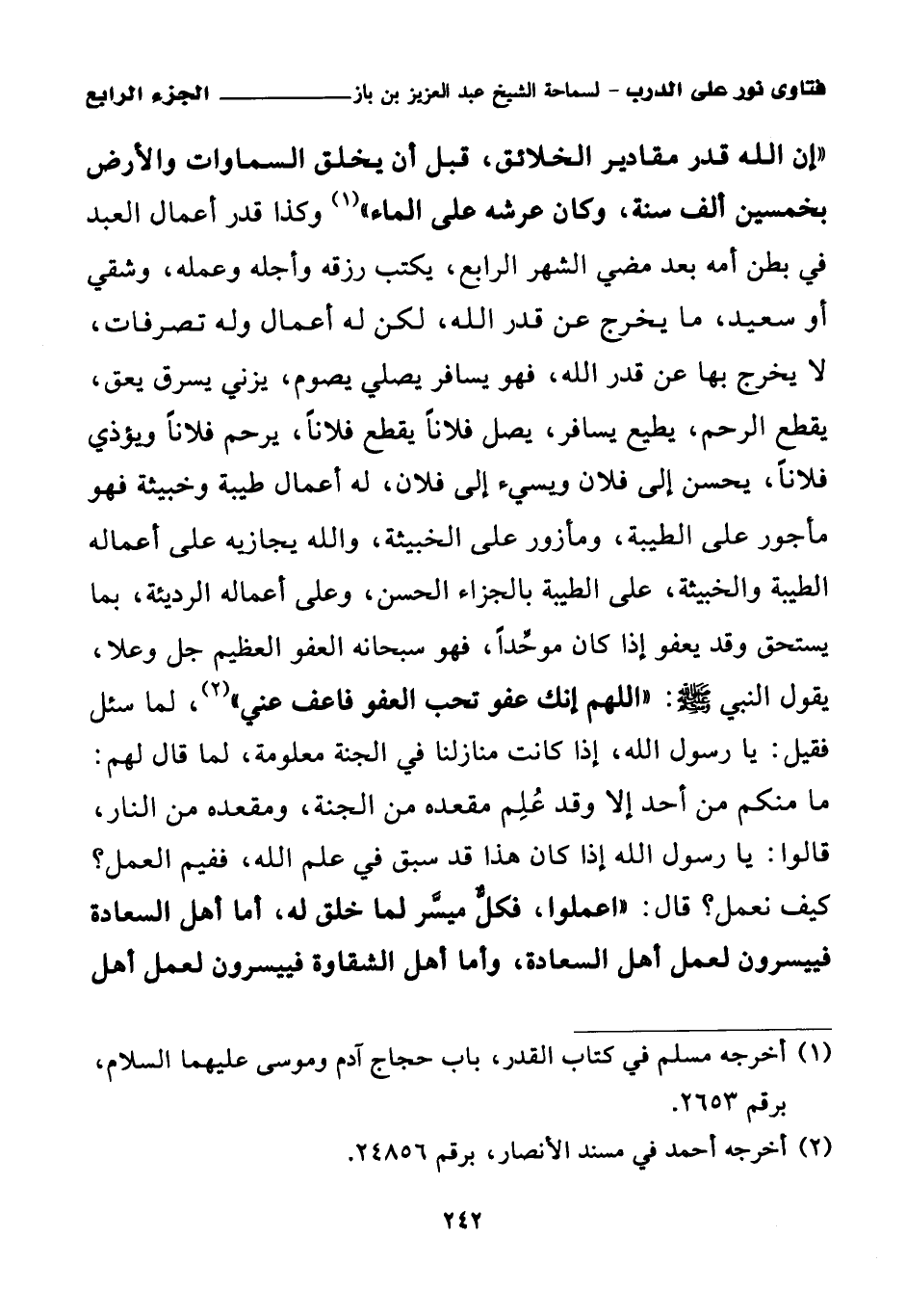«إن الله قدر مقادير الخلائق، قبل أن يخلق السماوات والأرض بخمسين ألف سنة، وكان عرشه على الماء (¬1)»، وكذا قدر أعمال العبد في بطن أمه بعد مضي الشهر الرابع، يكتب رزقه وأجله وعمله، وشقي أو سعيد، ما يخرج عن قدر الله، لكن له أعمال وله تصرفات، لا يخرج بها عن قدر الله، فهو يسافر، يصلي، يصوم، يزني، يسرق، يعق، يقطع الرحم، يطيع، يسافر، يصل فلانا، يقطع فلانا، يرحم فلانا ويؤذي فلانا، يحسن إلى فلان ويسيء إلى فلان، له أعمال طيبة وخبيثة فهو مأجور على الطيبة، ومأزور على الخبيثة، والله يجازيه على أعماله الطيبة والخبيثة، على الطبية بالجزاء الحسن، وعلى أعماله الرديئة، بما يستحق وقد يعفو إذا كان موحدا، فهو سبحانه العفو العظيم جل وعلا، يقول النبي صلى الله عليه وسلم: «اللهم إنك عفو تحب العفو فاعف عني (¬2)»، لما سئل فقيل: «يا رسول الله، إذا كانت منازلنا في الجنة معلومة، لما قال لهم: ما منكم من أحد إلا وقد علم مقعده من الجنة، ومقعده من النار، قالوا: يا رسول الله إذا كان هذا قد سبق في علم الله، ففيم العمل؟ كيف نعمل؟ قال: اعملوا، فكل ميسر لما خلق له، أما أهل السعادة فييسرون لعمل أهل السعادة، وأما أهل الشقاوة فييسرون لعمل أهل