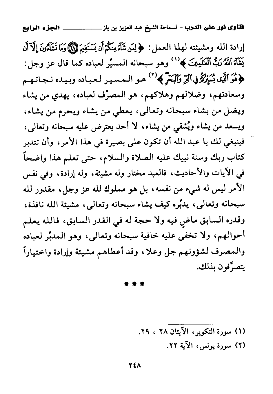 إرادة الله ومشيئته لهذا العمل: {لِمَنْ شَاءَ مِنْكُمْ أَنْ يَسْتَقِيمَ} (¬1) {وَمَا تَشَاءُونَ إِلَّا أَنْ يَشَاءَ اللَّهُ رَبُّ الْعَالَمِينَ} (¬2) وهو سبحانه المسير لعباده كما قال عز وجل: {هُوَ الَّذِي يُسَيِّرُكُمْ فِي الْبَرِّ وَالْبَحْرِ} (¬3) هو المسير لعباده وبيده نجاتهم وسعادتهم، وضلالهم وهلاكهم، هو المصرف لعباده، يهدي من يشاء ويضل من يشاء سبحانه وتعالى، يعطي من يشاء، ويحرم من يشاء، ويسعد من يشاء، ويشقي من يشاء، لا أحد يعترض عليه سبحانه وتعالى، فينبغي لك يا عبد الله أن تكون على بصيرة في هذا الأمر، وأن تتدبر كتاب ربك وسنة نبيك عليه الصلاة والسلام، حتى تعلم هذا واضحا في الآيات والأحاديث، فالعبد مختار وله مشيئة، وله إرادة، وفي نفس الأمر ليس له شيء من نفسه، بل هو مملوك لله عز وجل، مقدور لله سبحانه وتعالى، يدبره كيف يشاء سبحانه وتعالى، مشيئة الله نافذة، وقدره السابق ماض فيه ولا حجة له في القدر السابق، فالله يعلم أحوالهم، ولا تخفى عليه خافية سبحانه وتعالى، وهو المدبر لعباده والمصرف لشؤونهم جل وعلا، وقد أعطاهم مشيئة وإرادة واختيارا يتصرفون بذلك.