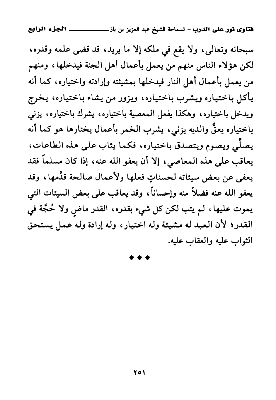 سبحانه وتعالى، ولا يقع في ملكه إلا ما يريد، قد قضى علمه وقدره، لكن هؤلاء الناس منهم من يعمل بأعمال أهل الجنة فيدخلها، ومنهم من يعمل بأعمال أهل النار فيدخلها بمشيئته وإرادته واختياره، كما أنه يأكل باختياره ويشرب باختياره، ويزور من يشاء باختياره، يخرج ويدخل باختياره، وهكذا يفعل المعصية باختياره، يشرك باختياره، يزني باختياره، يعق والديه، يزني، يشرب الخمر بأعمال يختارها هو كما أنه يصلي ويصوم ويتصدق باختياره، فكما يثاب على هذه الطاعات، يعاقب على هذه المعاصي، إلا أن يعفو الله عنه، إذا كان مسلما فقد يعفى عن بعض سيئاته لحسنات فعلها ولأعمال صالحة قدمها، وقد يعفو الله عنه فضلا منه وإحسانا، وقد يعاقب على بعض السيئات التي يموت عليها، لم يتب لكن كل شيء بقدره، القدر ماض ولا حجة في القدر؛ لأن العبد له مشيئة وله اختيار، وله إرادة وله عمل يستحق الثواب عليه والعقاب عليه.