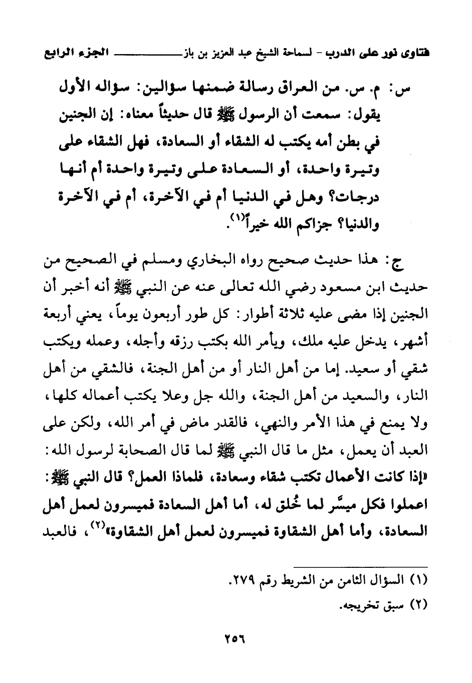 س: م. س. من العراق رسالة ضمنها سؤالين: سؤاله الأول يقول: سمعت أن الرسول صلى الله عليه وسلم قال حديثا معناه: إن الجنين في بطن أمه يكتب له الشقاء والسعادة، فهل الشقاء على وتيرة واحدة، أو السعادة على وتيرة واحدة أم أنها درجات؟ وهل في الدنيا أم في الآخرة، أم في الآخرة والدنيا؟ جزاكم الله خيرا (¬1).