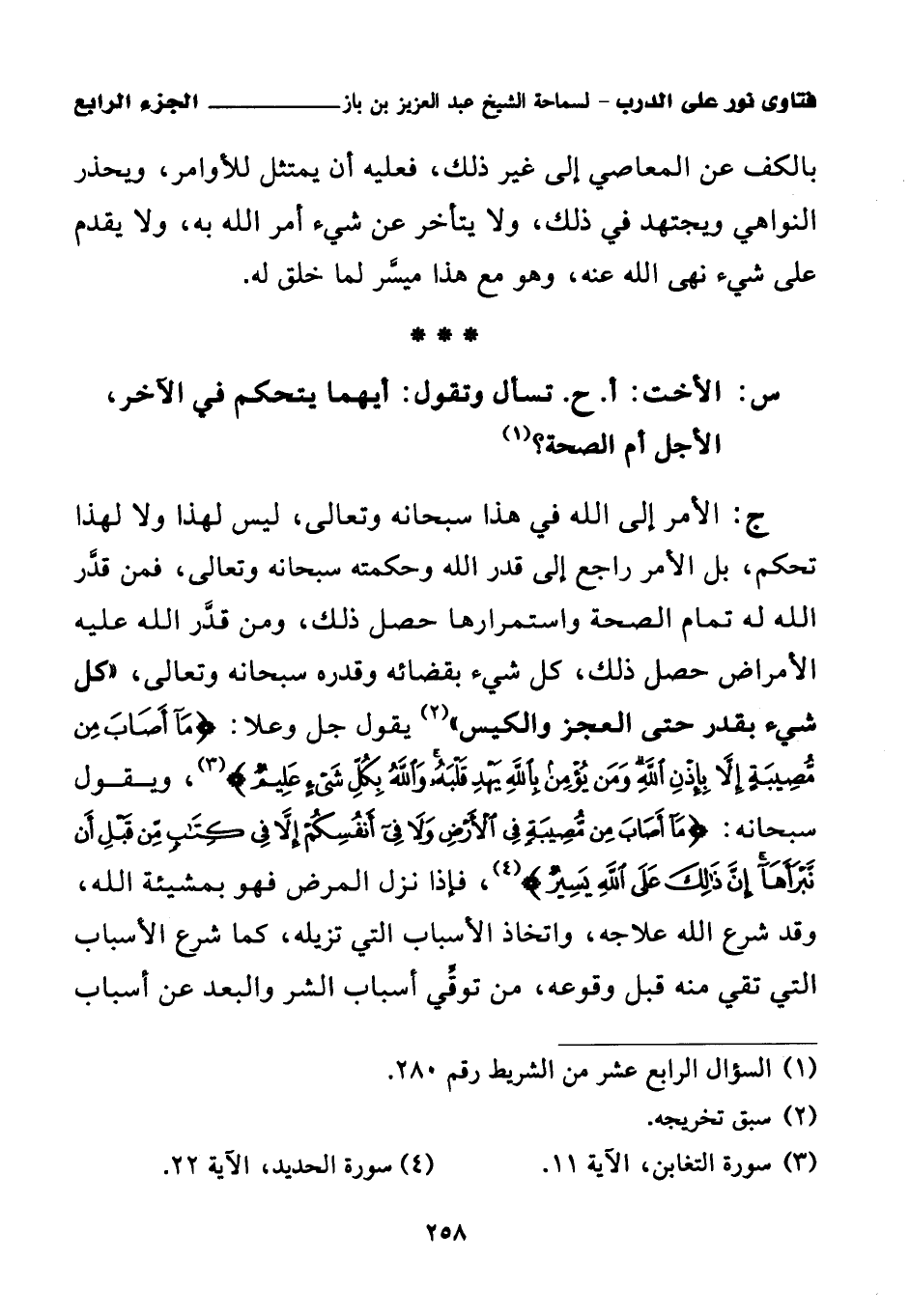 ج: الأمر إلى الله في هذا سبحانه وتعالى، ليس لهذا ولا لهذا تحكم، بل الأمر راجع إلى قدر الله وحكمته سبحانه وتعالى، فمن قدر الله له تمام الصحة واستمرارها حصل ذلك، ومن قدر الله عليه الأمراض حصل ذلك، كل شيء بقضائه وقدره سبحانه وتعالى، «كل شيء بقدر حتى العجز والكيس (¬2)» يقول جل وعلا: {مَا أَصَابَ مِنْ مُصِيبَةٍ إِلَّا بِإِذْنِ اللَّهِ وَمَنْ يُؤْمِنْ بِاللَّهِ يَهْدِ قَلْبَهُ وَاللَّهُ بِكُلِّ شَيْءٍ عَلِيمٌ} (¬3)، ويقول سبحانه: {مَا أَصَابَ مِنْ مُصِيبَةٍ فِي الْأَرْضِ وَلَا فِي أَنْفُسِكُمْ إِلَّا فِي كِتَابٍ مِنْ قَبْلِ أَنْ نَبْرَأَهَا إِنَّ ذَلِكَ عَلَى اللَّهِ يَسِيرٌ} (¬4)، فإذا نزل المرض فهو بمشيئة الله، وقد شرع الله علاجه، واتخاذ الأسباب التي تزيله، كما شرع الأسباب التي تقي منه قبل وقوعه من توقي أسباب الشر والبعد عن أسباب