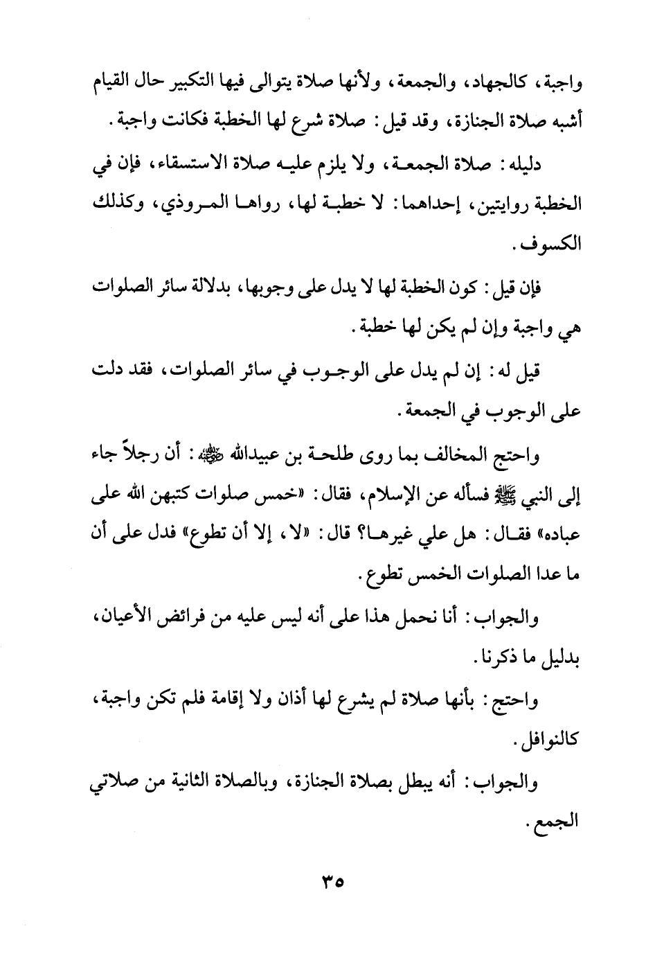 دليله: صلاة الجمعة، ولا يلزم عليه صلاة الاستسقاء، فإن في الخطبة روايتين، إحداهما: لا خطبة لها، رواها المروذي، وكذلك الكسوف.