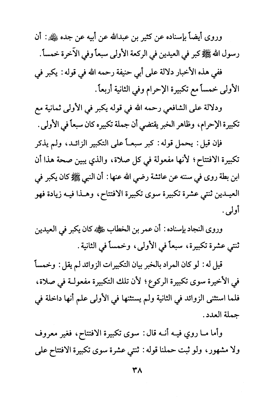 وروى أيضًا بإسناده عن كثير بن عبد الله عن أبيه عن جده - رضي الله عنهم -: أن رسول الله - صلى الله عليه وسلم - كبر في العيدين في الركعة الأولى سبعًا وفي الآخرة خمسًا.