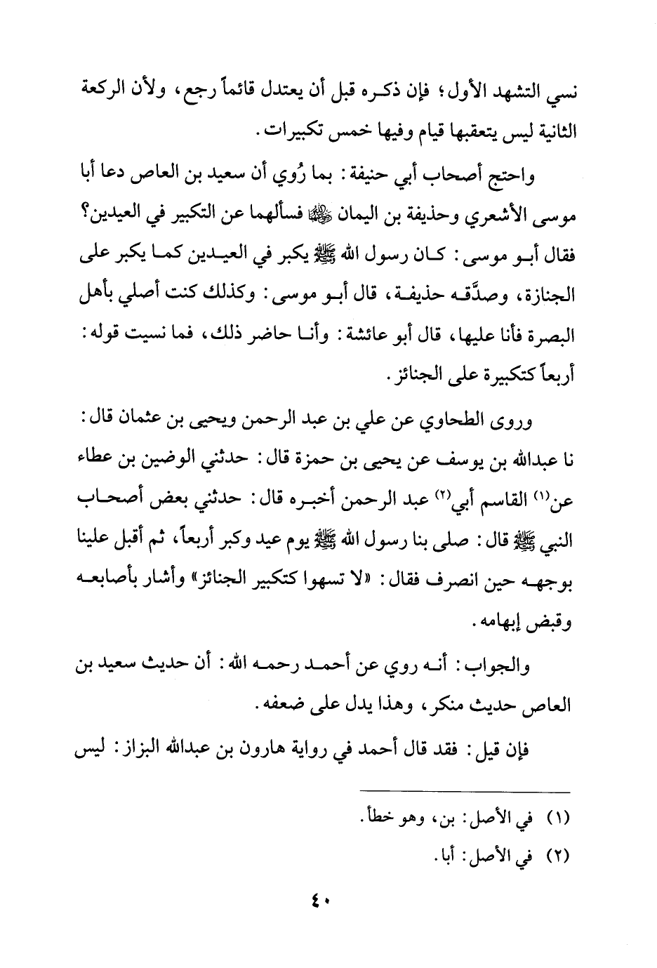 واحتج أصحاب أبي حنيفة: بما رُوي أن سعيد بن العاص دعا أبا موسى الأشعري وحذيفة بن اليمان - رضي الله عنهما - فسألهما عن التكبير في العيدين؟ فقال أبو موسى: كان رسول الله - صلى الله عليه وسلم - يكبر في العيدين كما يكبر على الجنازة، وصدَّقه حذيفة، قال أبو موسى: وكذلك كنت أصلي بأهل البصرة فأنا عليها، قال أبو عائشة: وأنا حاضر ذلك، فما نسيت قوله: أربعًا كتكبيرة على الجنائز.