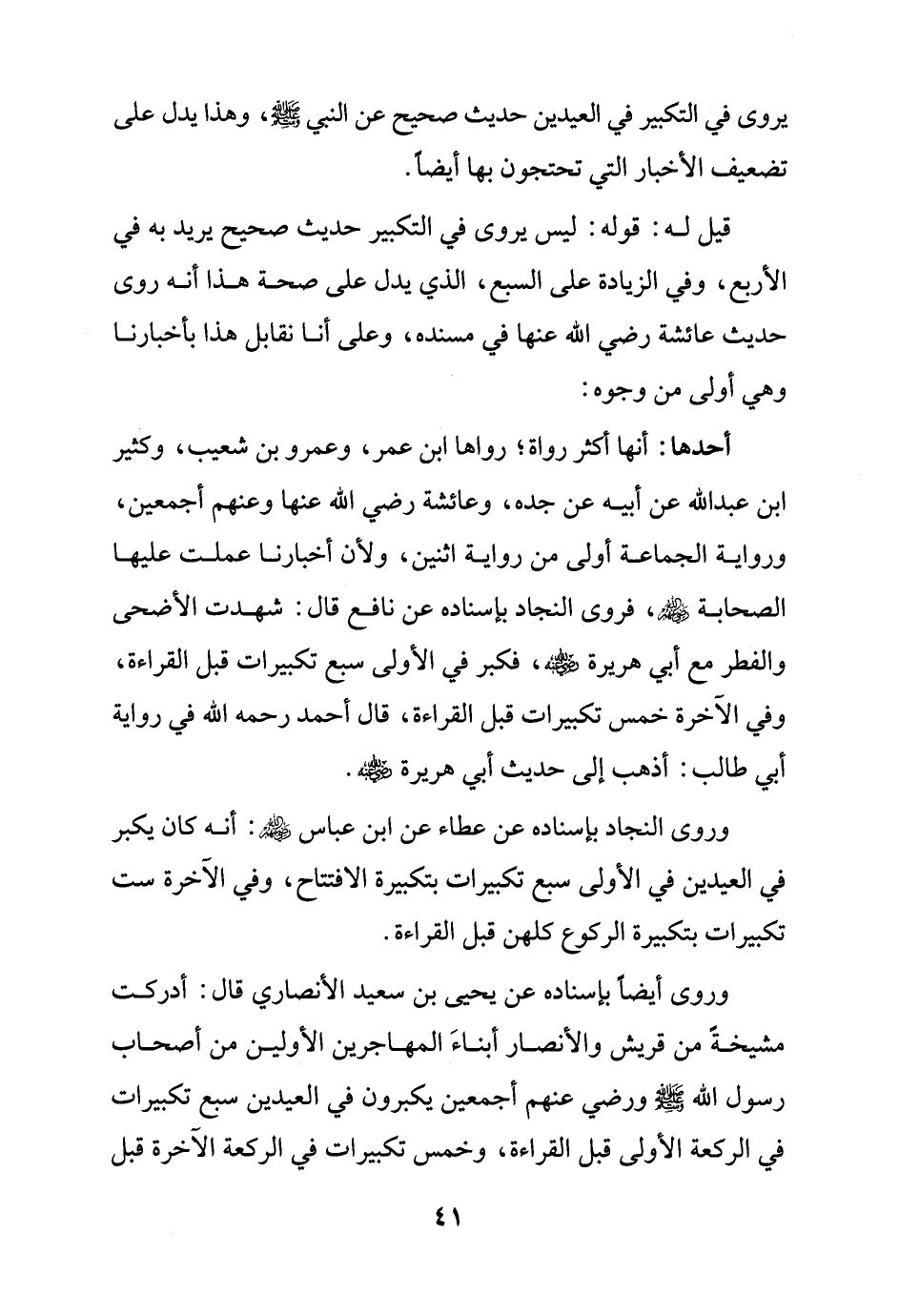 أحدها: أنها أكثر رواة؛ رواها ابن عمر، وعمرو بن شعيب، وكثير بن عبد الله عن أبيه عن جده، وعائشة رضي الله عنها وعنهم أجمعين، ورواية الجماعة أولى من رواية اثنين، ولأن أخبارنا عملت عليها الصحابة - رضي الله عنهم -، فروى النجاد بإسناده عن نافع قال: شهدت الأضحى والفطر مع أبي هريرة - رضي الله عنه -، فكبر في الأولى سبع تكبيرات قبل القراءة، وفي الآخرة خمس تكبيرات قبل القراءة، قال أحمد رحمه الله في رواية أبي طالب: أذهب إلى حديث أبي هريرة - رضي الله عنه -.
