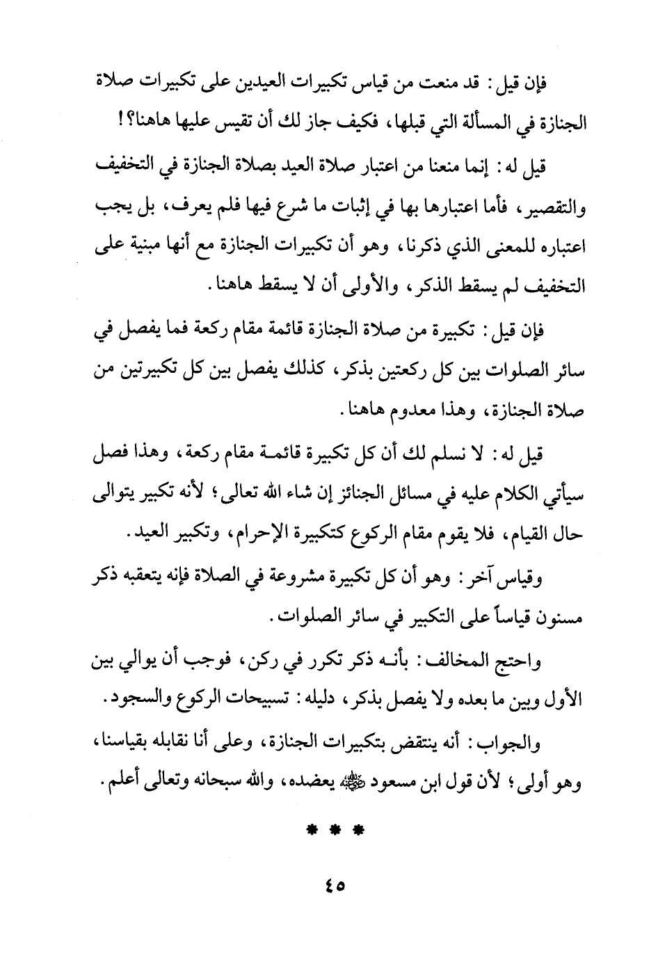 والجواب: أنه ينتقض بتكبيرات الجنازة، وعلى أنا نقابله بقياسنا، وهو أولى؛ لأن قول ابن مسعود - رضي الله عنه - يعضده، والله سبحانه وتعالى أعلم.