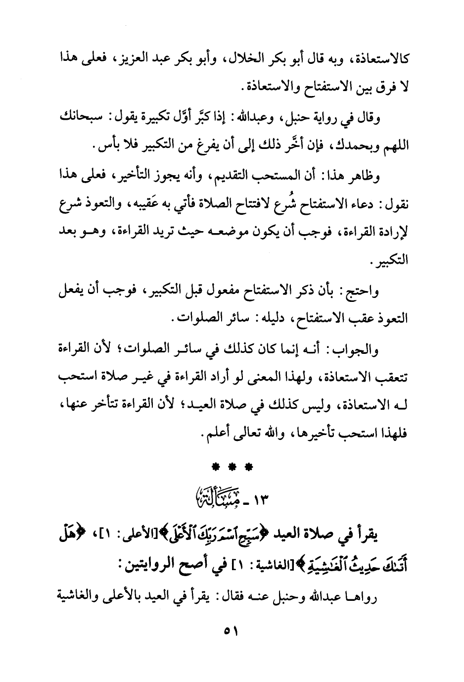 13 - مَسْألَة: يقرأ في صلاة العيد {سَبِّحِ اسْمَ رَبِّكَ الْأَعْلَى} [الأعلى: 1]، {هَلْ أَتَاكَ حَدِيثُ الْغَاشِيَةِ} [الغاشية: 1] في أصح الروايتين: