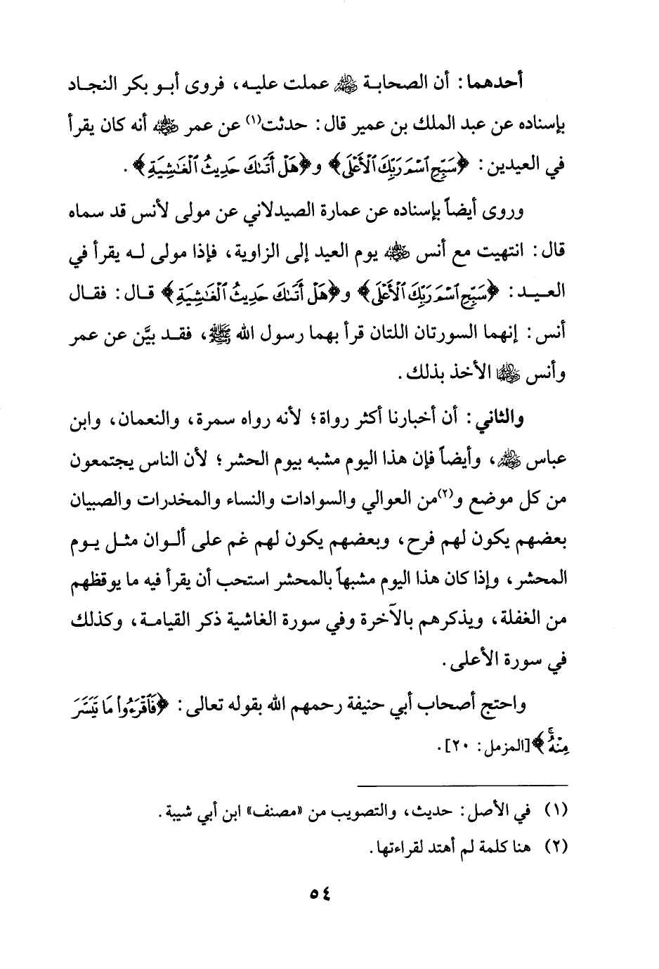 وروى أيضًا بإسناده عن عمارة الصيدلاني عن مولى لأنس قد سماه قال: انتهيت مع أنس - رضي الله عنه - يوم العيد إلى الزاوية، فإذا مولى له يقرأ في العيد: {سَبِّحِ اسْمَ رَبِّكَ الْأَعْلَى} و {هَلْ أَتَاكَ حَدِيثُ الْغَاشِيَةِ} قال: فقال أنس: إنهما السورتان اللتان قرأ بهما رسول الله - صلى الله عليه وسلم -، فقد بيَّن عن عمر وأنس - رضي الله عنهما - الأخذ بذلك.