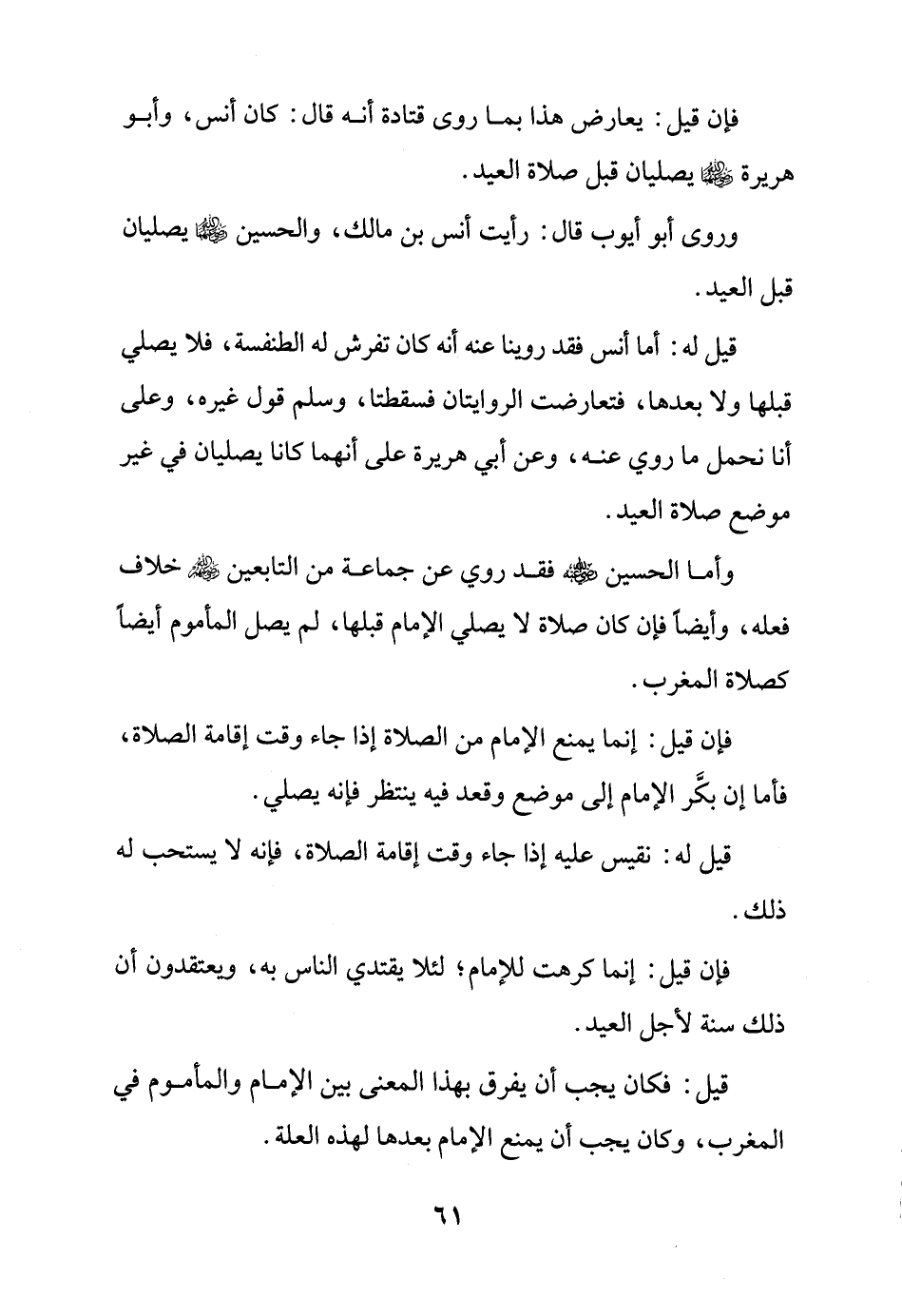 قيل له: أما أنس فقد روينا عنه أنه كان تفرش له الطنفسة، فلا يصلي قبلها ولا بعدها، فتعارضت الروايتان فسقطتا، وسلم قول غيره، وعلى أنا نحمل ما روي عنه، وعن أبي هريرة على أنهما كانا يصليان في غير موضع صلاة العيد.