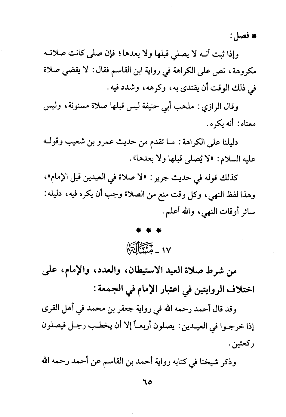 17 - مَسْألَة: من شرط صلاة العيد الاستيطان، والعدد، والإمام، على اختلاف الروايتين في اعتبار الإمام في الجمعة: