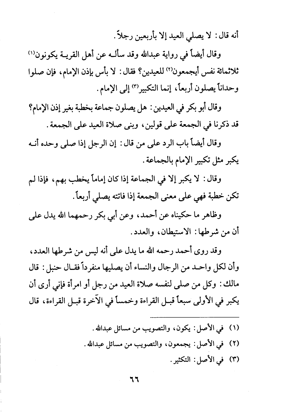 وقد روى أحمد رحمه الله ما يدل على أنه ليس من شرطها العدد، وأن لكل واحد من الرجال والنساء أن يصليها منفردًا فقال حنبل: قال مالك: وكل من صلى لنفسه صلاة العيد من رجل أو امرأة فإني أرى أن يكبر في الأولى سبعًا قبل القراءة وخمسًا في الآخرة قبل القراءة، قال