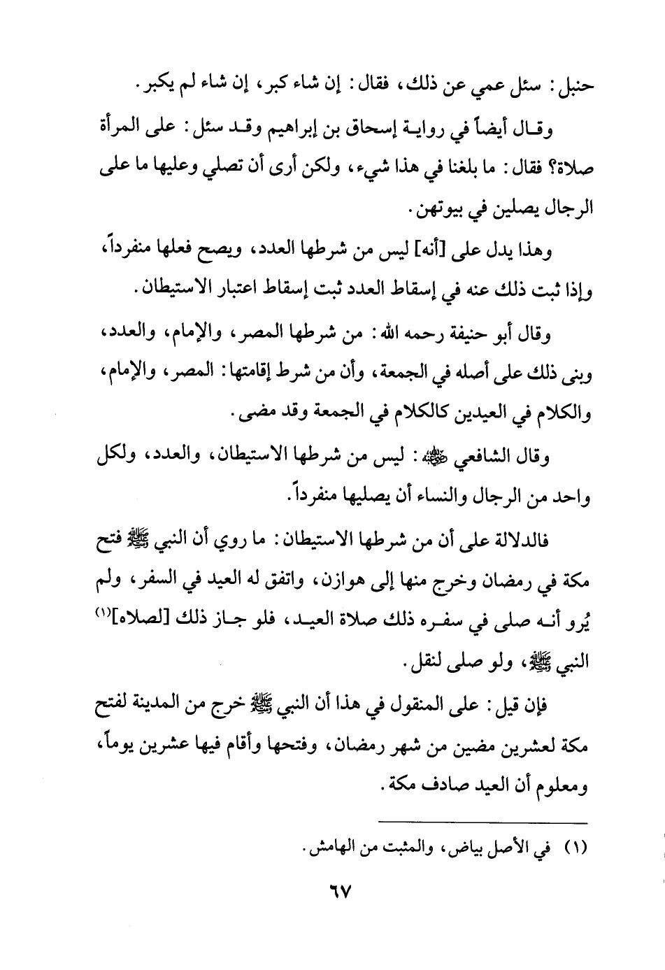وقال أبو حنيفة رحمه الله: من شرطها المصر، والإمام، والعدد، وبنى ذلك على أصله في الجمعة، وأن من شرط إقامتها: المصر، والإمام، والكلام في العيدين كالكلام في الجمعة وقد مضى.