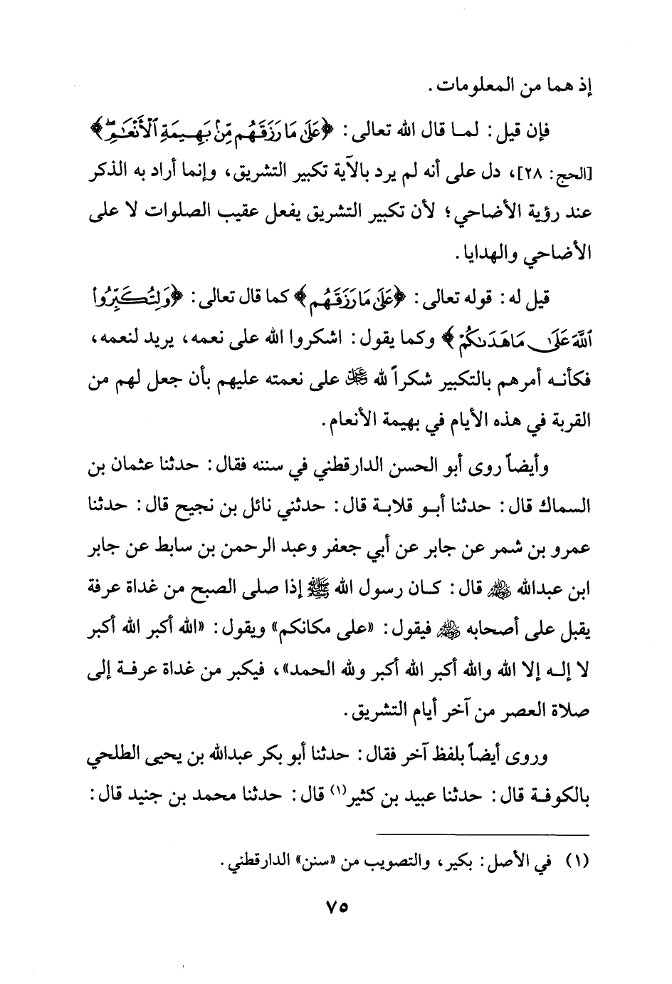 وأيضًا روى أبو الحسن الدارقطني في سننه فقال: حدثنا عثمان بن السماك قال: حدثنا أبو قلابة قال: حدثني نائل بن نجيح قال: حدثنا عمرو بن شمر عن جابر عن أبي جعفر وعبد الرحمن بن سابط عن جابر بن عبد الله - رضي الله عنهم - قال: كان رسول الله - صلى الله عليه وسلم - إذا صلى الصبح من غداة عرفة يقبل على أصحابه - رضي الله عنهم - فيقول: "على مكانكم" ويقول: "الله أكبر الله أكبر لا إله إلا الله والله أكبر الله أكبر ولله الحمد"، فيكبر من غداة عرفة إلى صلاة العصر من آخر أيام التشريق.