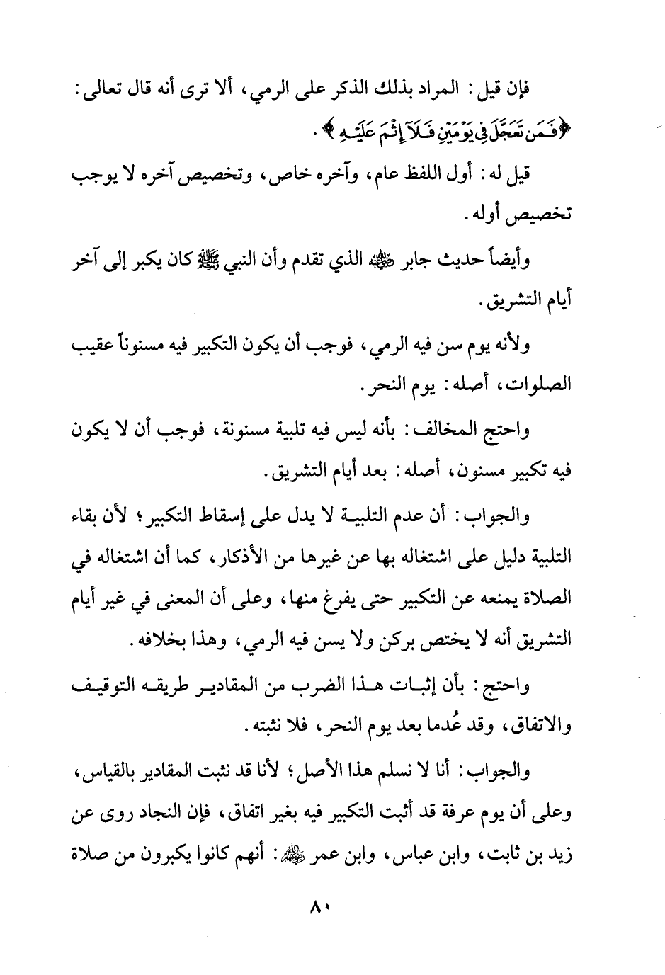 والجواب: أنا لا نسلم هذا الأصل؛ لأنا قد نثبت المقادير بالقياس، وعلى أن يوم عرفة قد أثبت التكبير فيه بغير اتفاق، فإن النجاد روى عن زيد بن ثابت، وابن عباس، وابن عمر - رضي الله عنهم -: أنهم كانوا يكبرون من صلاة