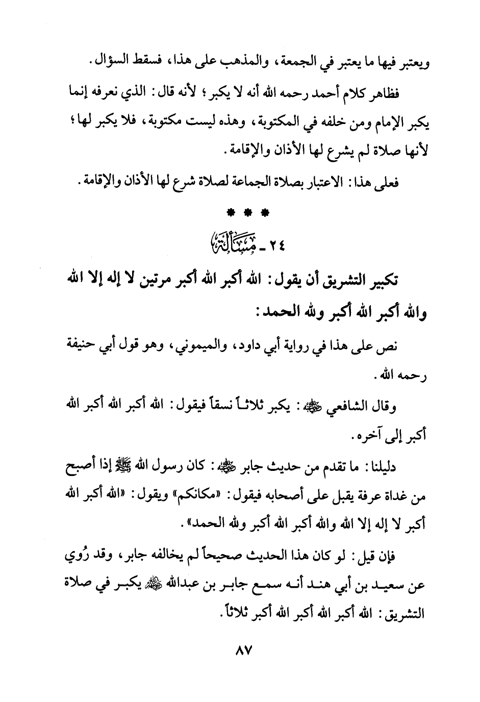24 - مَسْألَة: تكبير التشريق أن يقول: الله أكبر الله أكبر مرتين لا إله إلا الله والله أكبر الله أكبر ولله الحمد: